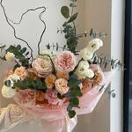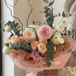 Бақша раушандарының, нәзік спрей ранункулустарының және текстуралы екпіндердің көлемді композициясы эвкалипт пен сәндік бұтақтармен толықтырылған. Жұмсақ шабдалы ұнтағы реңктері жылы, романтикалық атмосфера жасайды, ал бұтақтардың графикалық сызықтары гүл шоғына заманауи, көркем көрініс береді. Мөлдір қаптама ауадай сезімді сақтайды және гүлдердің күрделі құрылымын ерекшелейді. Керемет сыйлық, махаббат туралы мәлімдеме немесе ерекше жағдай үшін стильді нұсқа.