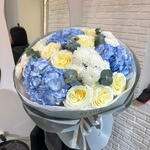 Нәзіктік пен әсемдікке толы сүйкімді гүл шоғы: — *Ашық гортензия* көлем мен романтикалық көңіл-күй сыйлайды — *Пияз раушандары* сән-салтанат, нәзіктік және нәзік хош иіс қосады — *Хризантемалар* жарықтық, балғындық сыйлайды және күтімді бейнелейді Әрбір гүл бір-бірін толықтырады, үйлесімді композиция жасайды — махаббат декларациясы, құттықтау немесе жай ғана күлкі сыйлау үшін тамаша гүл шоғы. Әмбебап, жылы және мәнерлі.