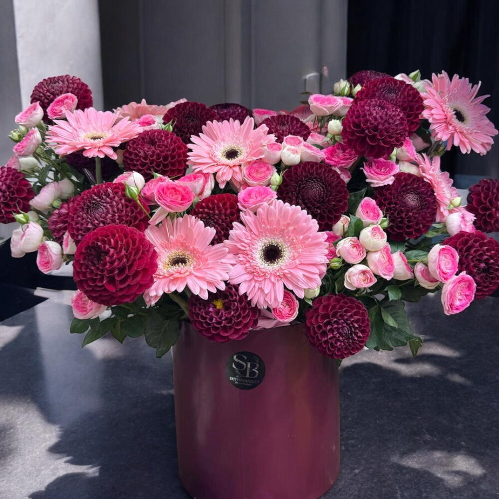 спрей-розы - 13 дана розовые герберы - 7 дана ветки декоративной зелени - 5 дана хризантемы-помпоны - 9 дана