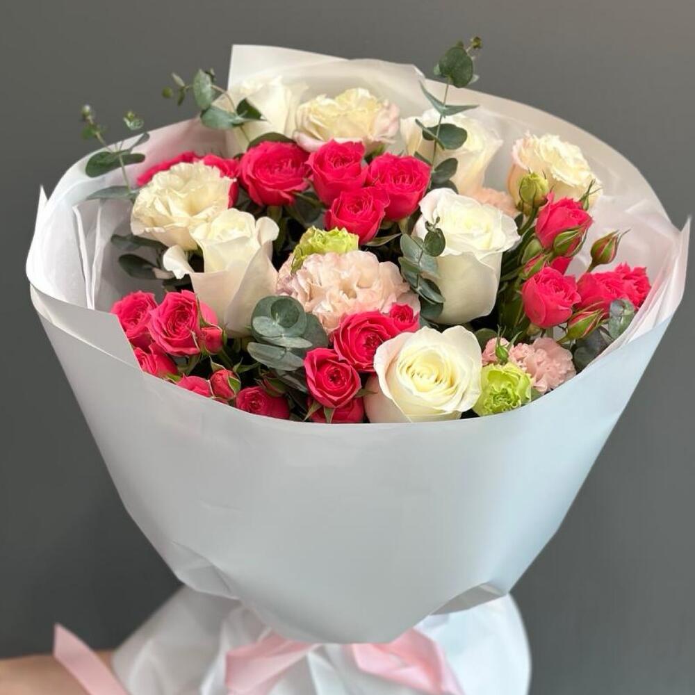 Бұта раушаны - 3 дана Эвкалипт - 2 дана Раушан - 5 дана Эустома - 3 дана