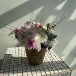 Бұта раушаны - 1 дана Хризантема бұтасы - 5 дана Оазис - 1 дана Себет өрілген - 1 дана Эвкалипт Цинерея - 1 дана