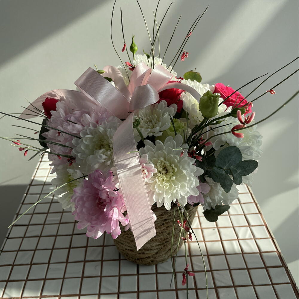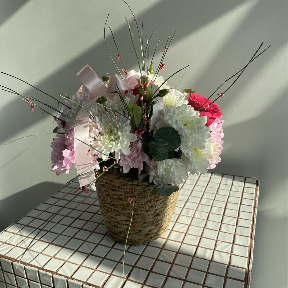 Бұта раушаны - 1 дана Хризантема бұтасы - 5 дана Оазис - 1 дана Себет өрілген - 1 дана Эвкалипт Цинерея - 1 дана
