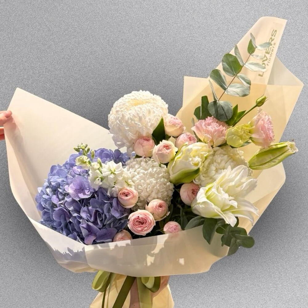 Гортензия - 1 дана Лизиантус - 1 дана Лилия - 1 дана Хризантема одноголовая - 3 дана Эвкалипт Цинерея - 2 дана Спрей роза - 2 дана