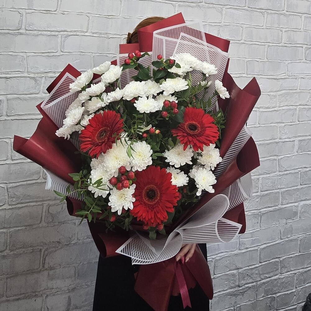 Этот изысканный монобукет, состоящий из 6 кустовых хризантем, дополнен свежим настроением трех притягательных гербер и красочной ноткой в виде трех веток кустового гиперикума красного цвета. Зеленые акценты трех веток фисташки замечательно подчеркивают естественную красоту букета. Все это изящно упаковано в стильную упаковку, что делает его идеальным для подарка!