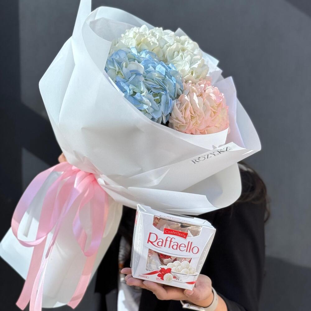 Гортензия - 3 дана Раффаэлло - 1 дана Дизайнерлік қаптама - 5 дана