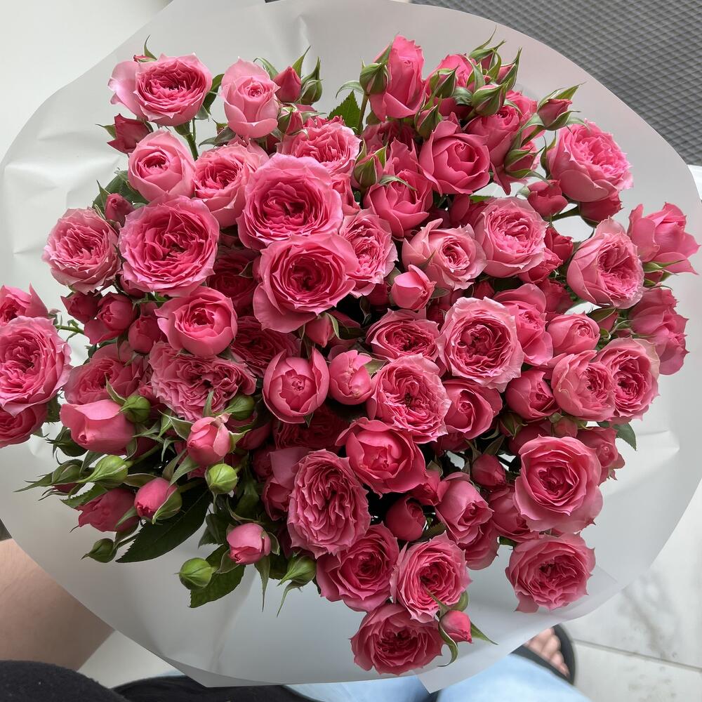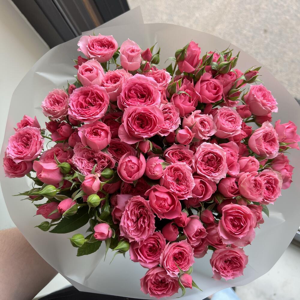 стильный моно букет из кустовых роз, кустовые розы малиновые, стойкость до 2х недель