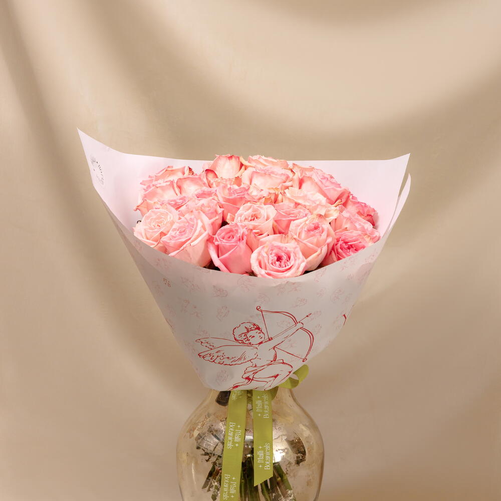 Нәзік бақша хош иісті раушандардан жасалған букет — жұмсақтық пен мәңгілік сүйіспеншіліктің көрінісі. Олардың нәзік реңі букетті талғампаз әрі сәнді етеді. Тақырыптық қағазға және Malli Botanicals қорабына оралған, ашықхат қосу мүмкіндігі бар. Суретте букет S өлшемінде, 25 дана.