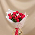 Пион тәрізді талғампаз раушан гүлдерінен жасалған букет — нәзік романтика мен құштарлықтың көрінісі. Олардың қою қызыл реңі букетті қалаулы әрі сәнді етеді. Тақырыптық қағазға және Malli Botanicals қорабына оралған, ашықхат қосу мүмкіндігі бар. Суретте S өлшеміндегі букет, 25 дана.