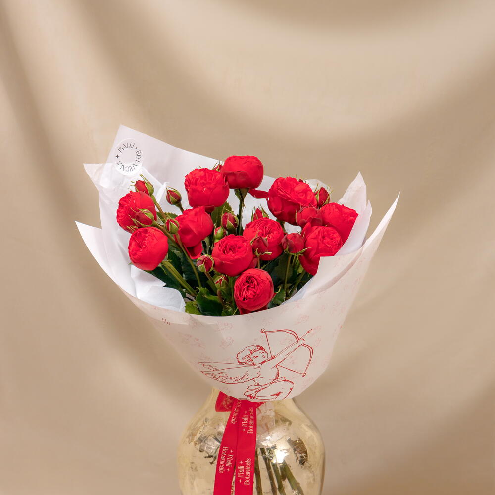Пион тәрізді талғампаз раушан гүлдерінен жасалған букет — нәзік романтика мен құштарлықтың көрінісі. Олардың қою қызыл реңі букетті қалаулы әрі сәнді етеді. Тақырыптық қағазға және Malli Botanicals қорабына оралған, ашықхат қосу мүмкіндігі бар. Суретте S өлшеміндегі букет, 25 дана.