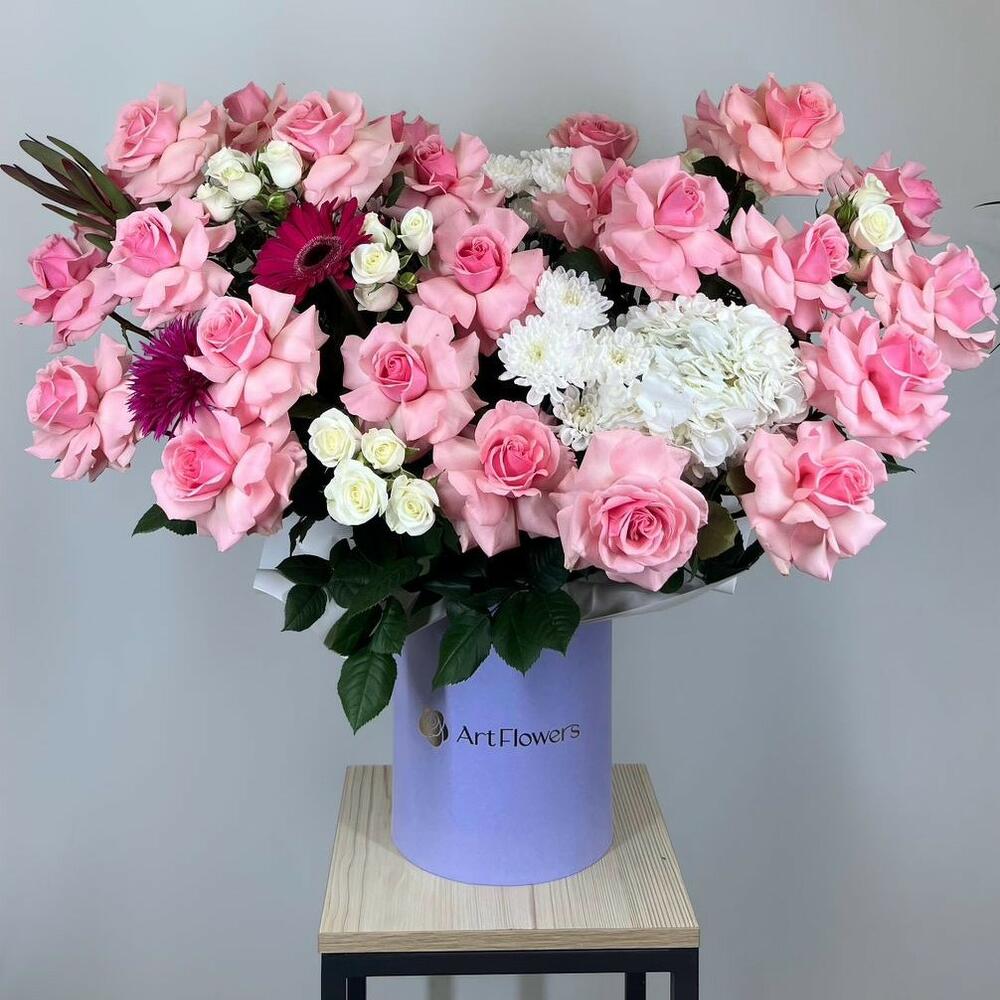 Гортензия - 1 дана Раушан - 21 дана Хризантема - 1 дана Гербера - 1 дана Қорап - 1 дана бұта раушандары - 2 дана