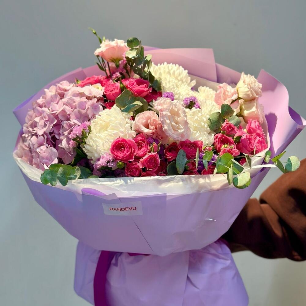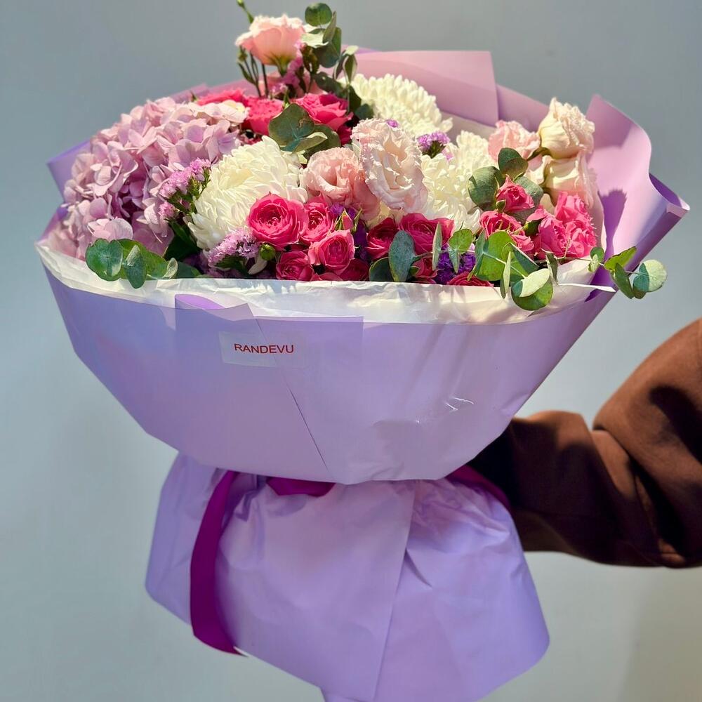 Гортензия - 1 дана Статица - 2 дана Эвкалипт - 2 дана Бұта раушаны - 3 дана Хризантема - 3 дана Эустома - 3 дана Атласты таспа - 1 дана Калька упаковка - 4 дана аквабумага - 5 дана