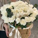 Белоснежные розы с добавлением эвкалипта в корзине. Выразите свои искренние чувства белыми розами