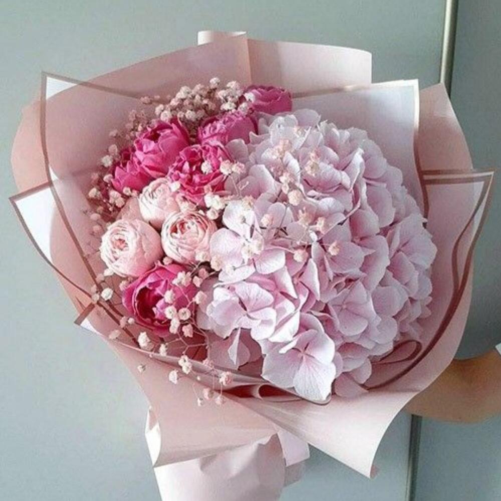 Гипсофила - 1 дана Қызғылт Гортензия - 1 дана Спрей роза - 4 дана аквабумага - 6 дана