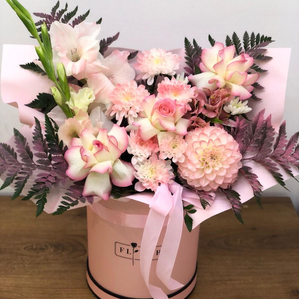 Альстроэмерия - 1 дана Хризантема бұтасы - 1 дана Гладиолус - 1 дана Французская роза - 3 дана Георгина - 1 дана ледр - 1 дана