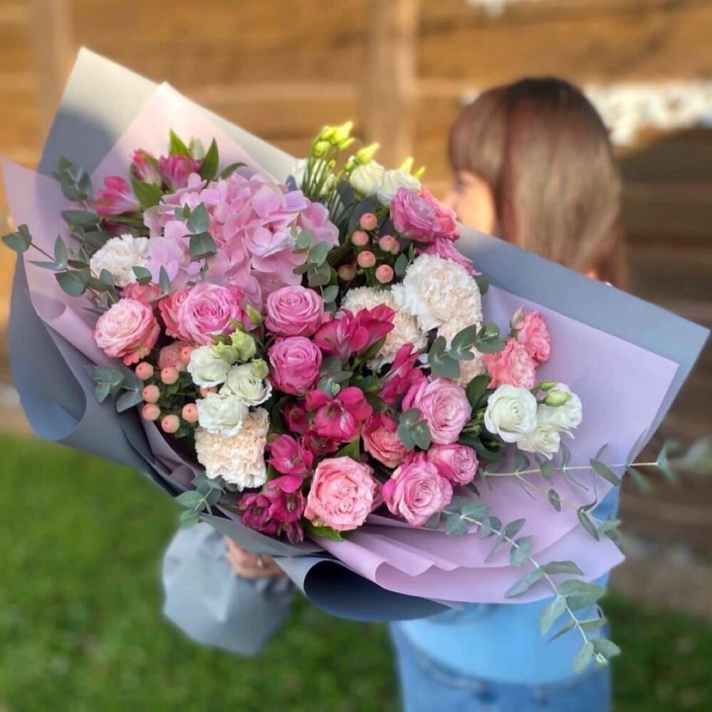 Альстроэмерия - 5 дана Гортензия - 1 дана Бұта раушаны - 8 дана Гвоздика кустовая - 5 дана эустома белая - 3 дана