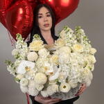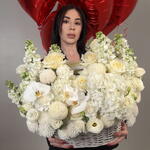 Гортензия - 3 дана Эустома - 7 дана Хризантема бұтасы - 7 дана Диантус - 9 дана Пион тәрізді раушан - 9 дана Ақ маттиола - 10 дана Фаленопсис - 3 дана мамокко хризантема - 11 дана