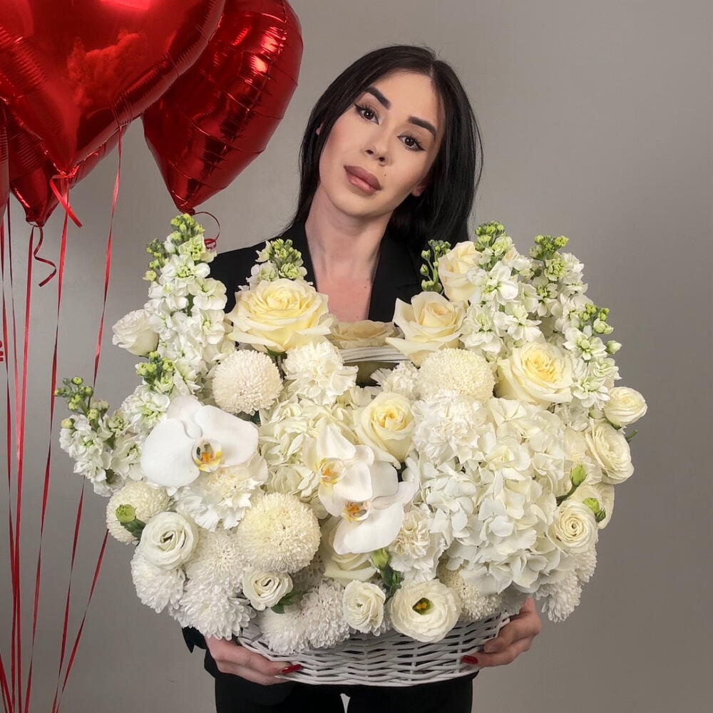 Гортензия - 3 дана Эустома - 7 дана Хризантема бұтасы - 7 дана Диантус - 9 дана Пион тәрізді раушан - 9 дана Ақ маттиола - 10 дана Фаленопсис - 3 дана мамокко хризантема - 11 дана