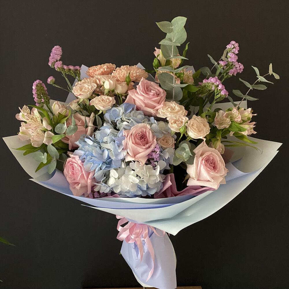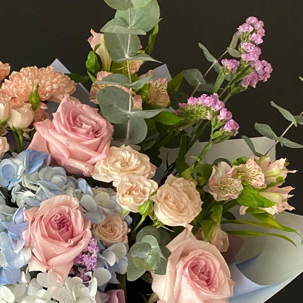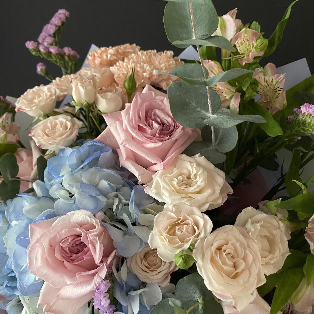 Альстроэмерия - 1 дана Гортензия - 1 дана Хризантема бұтасы - 1 дана Эвкалипт - 1 дана Дизайн күңгірт пленка - 1 дана Спрей роза - 2 дана сіздің тілектеріңізбен ашық хат - 1 дана роза эква - 5 дана