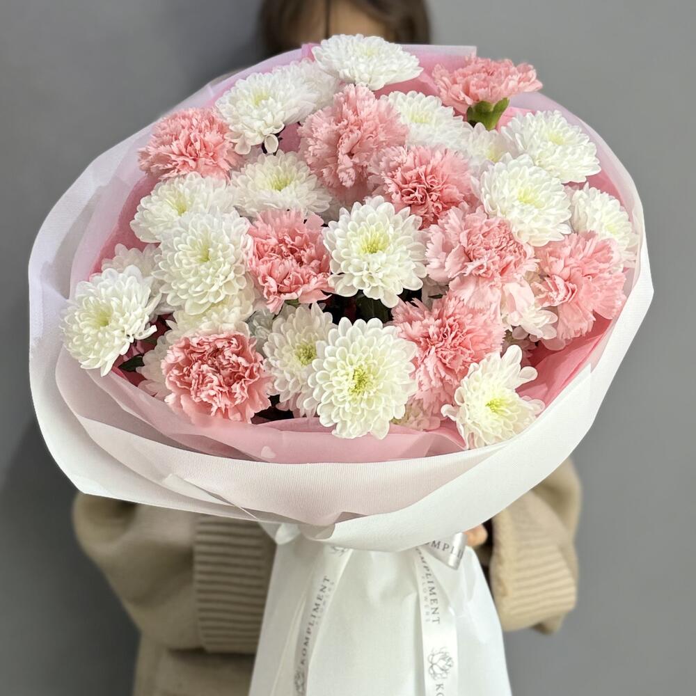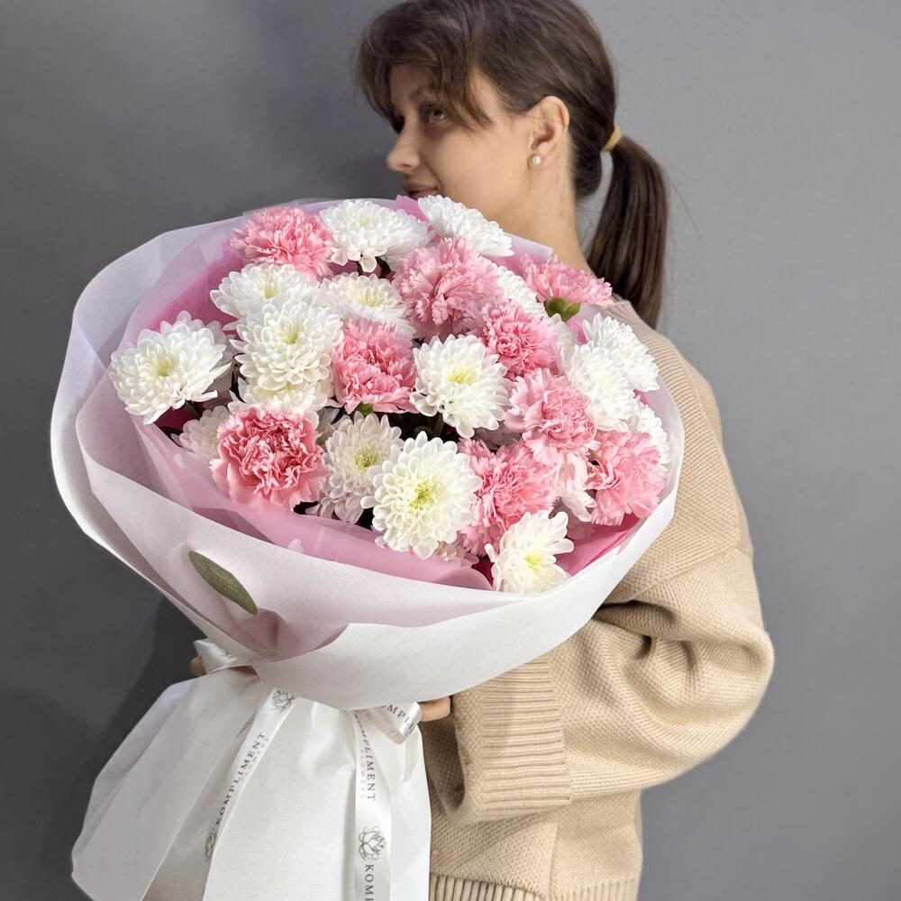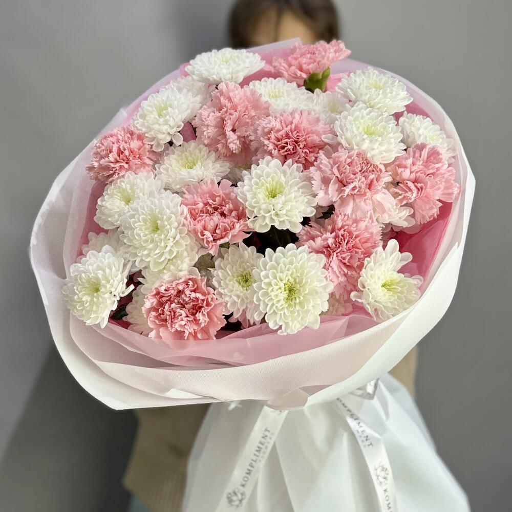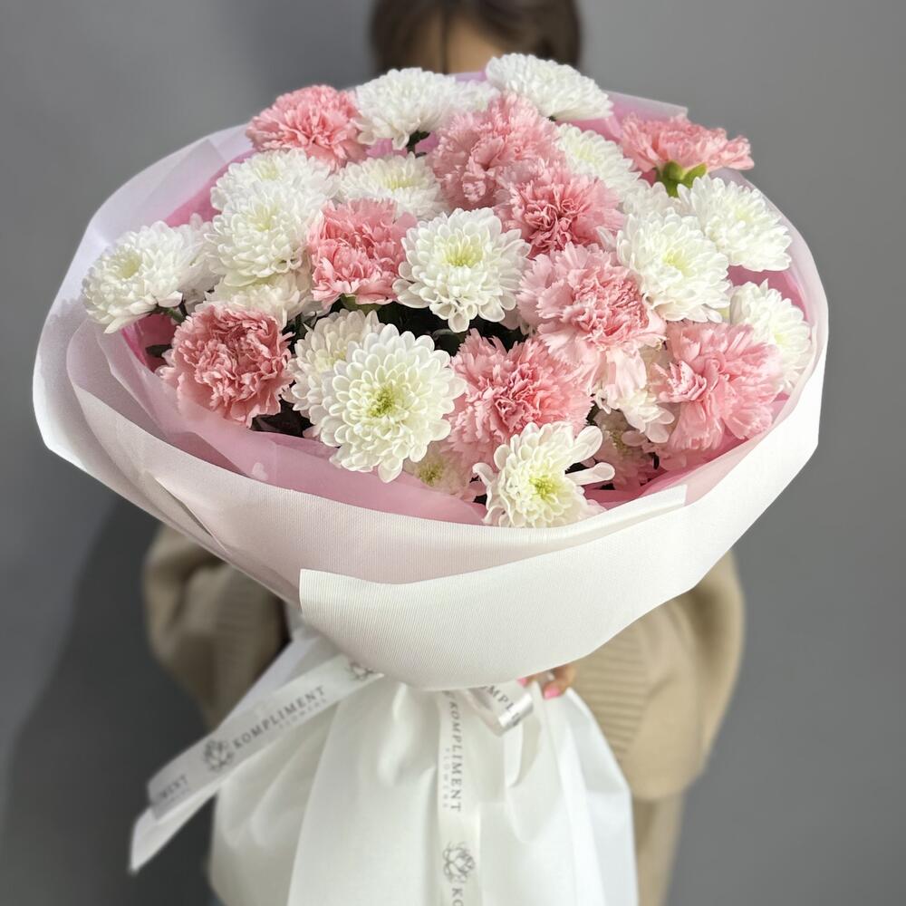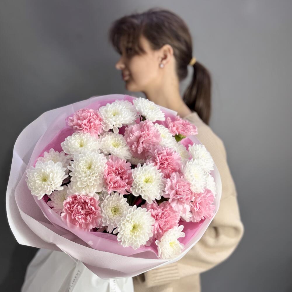 Идеальный букет ко Дню матери — диантус и кустовая хризантема в нежных оттенках Подарите маме тепло и заботу с букетом из диантуса и кустовой хризантемы в мягких розовых и белых тонах. Нежная композиция символизирует любовь, благодарность и внимание — всё, что хочется сказать в этот особенный день. Оформите заказ на доставку цветов ко Дню матери — порадуйте любимую маму красивым и свежим букетом!