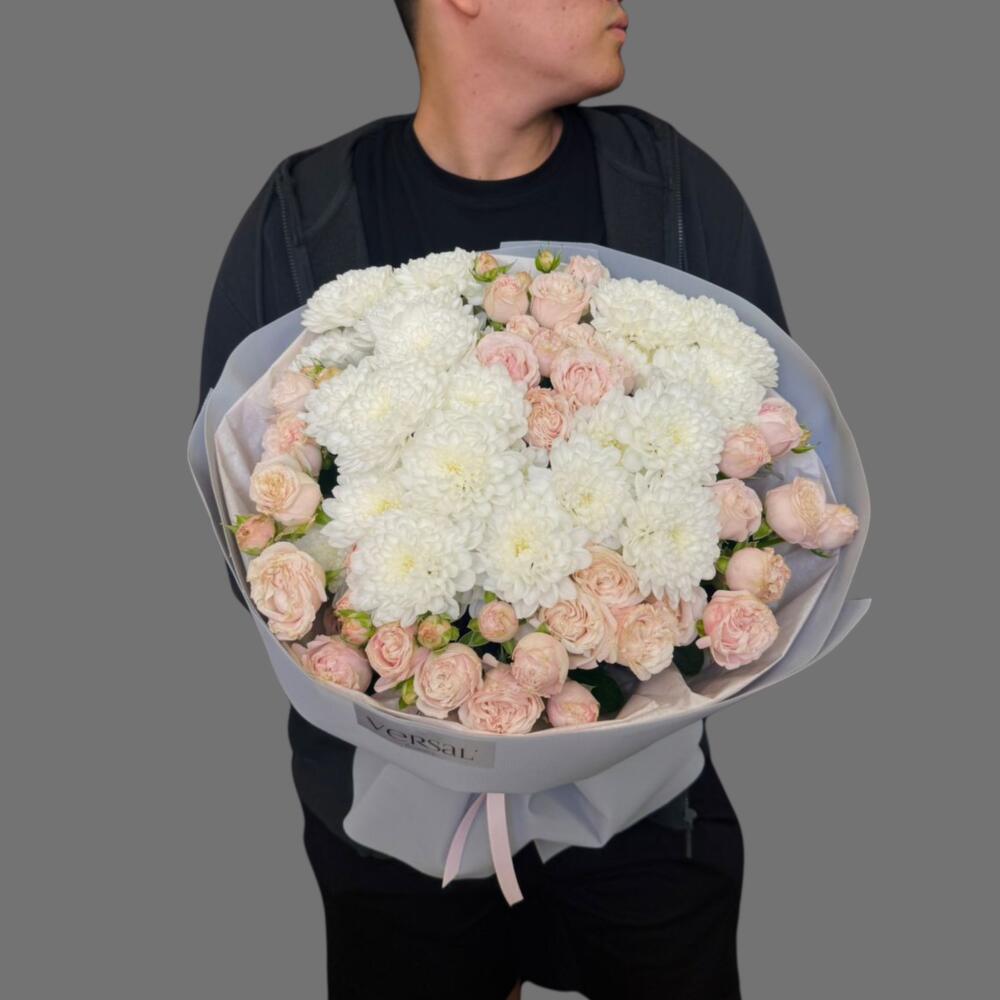 Нежный букет с кустовыми розами и хризантемами