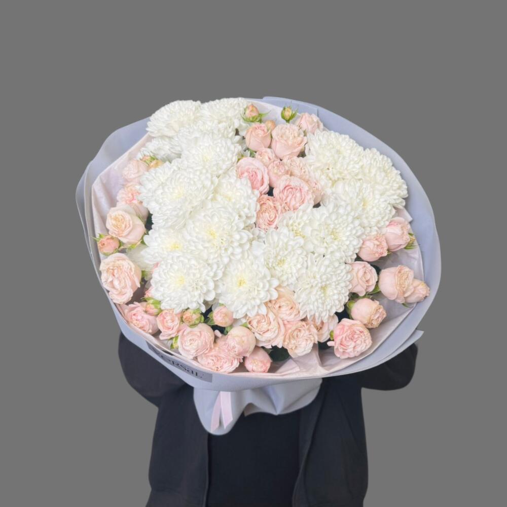Лёгкий и приятный букет из хризантем и роз в мягком оформлении. Подойдёт как знак внимания или подарок без повода.