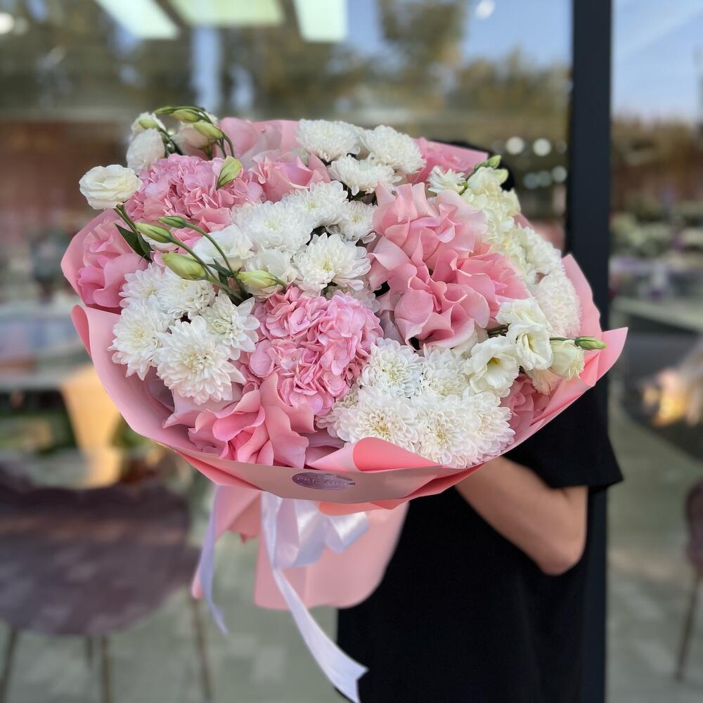 Хризантема бұтасы - 7 дана Роза Голландская - 9 дана Қызғылт Гортензия - 3 дана Лизиантус Алиса Белый - 4 дана