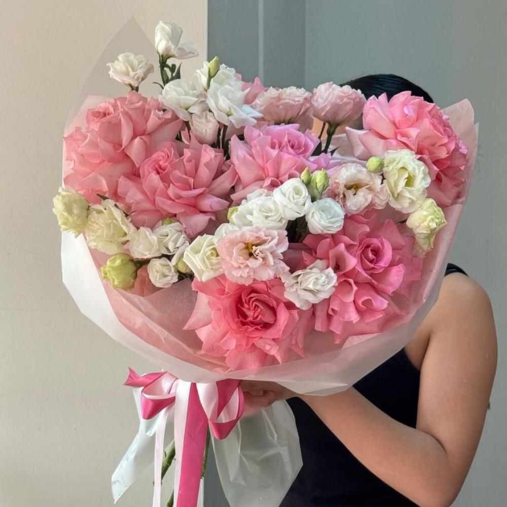 Очаровательный букет в нежной розово-белой гамме из французских роз и лизиантусов в нежном невесомом оформлении — идеальный комплимент для любимых. Воздушная упаковка с лентой подчёркивает утончённость композиции. Подойдёт на день рождения, признание в любви или просто для хорошего настроения.