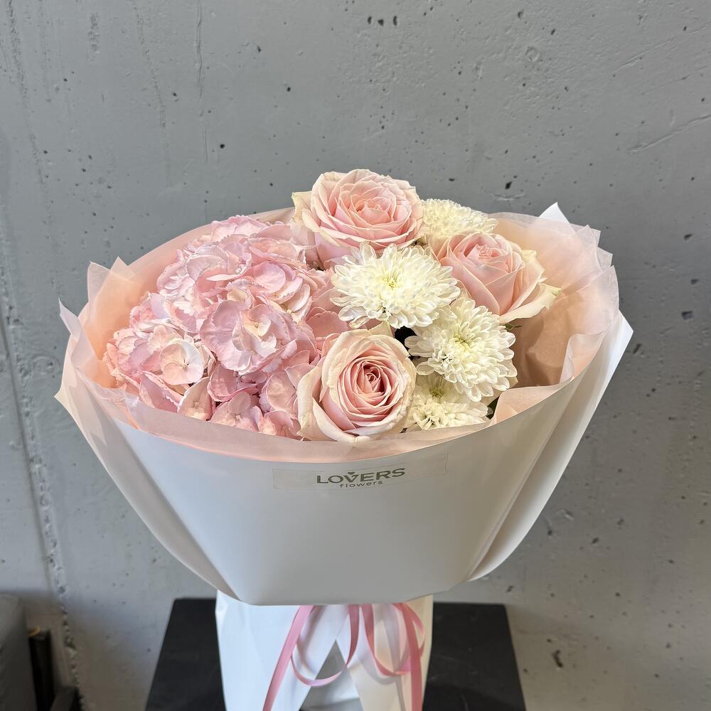 Гортензия - 1 дана Хризантема бұтасы - 1 дана раушан - 3 дана