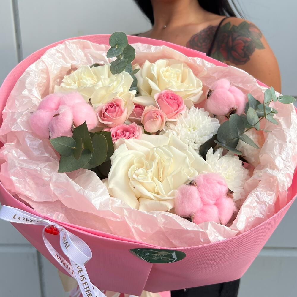 Букет, словно прикосновение шёлка — лёгкий, воздушный и романтичный. Пудрово-розовые оттенки, сливочная гамма и пушистые детали напоминают сладкий зефир, тающий на губах. 🩷