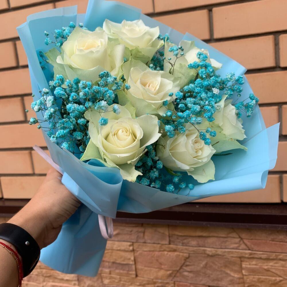 Нежный букет из кремово-белых роз, украшенных воздушной голубой гипсофилой. Станет элегантным дополнением к торту и подчеркнёт праздничное настроение. Мини-торт в голубом цвете с милым медвежонком и надписью For You. Подходит для подарка другу, любимому человеку или как сюрприз на праздник. Компактный размер и нежный крем делают его идеальным дополнением к букету.