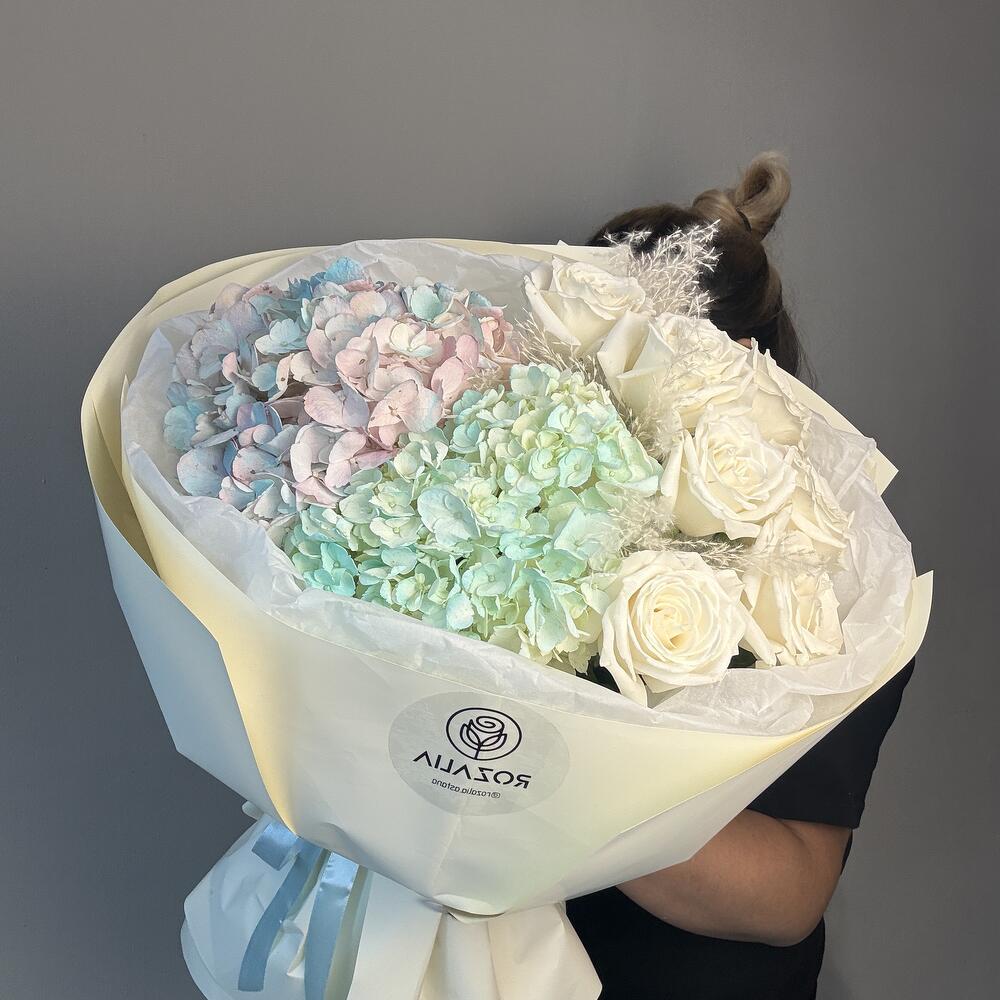 Гортензия - 2 дана Роза Эквадор - 7 дана Сухоцвет лагурус - 1 дана