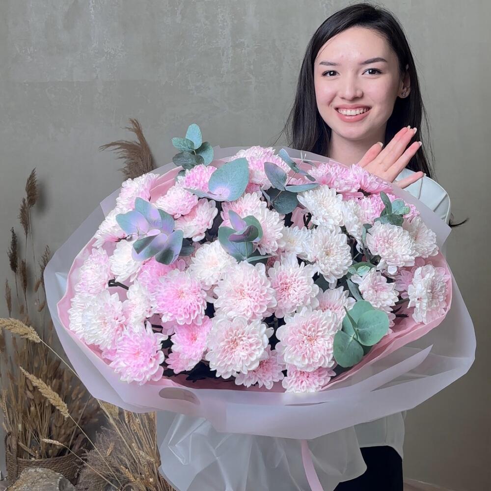 Воздушный, как лёгкое облако после дождя. Пышный букет из хризантем наполнен чистотой, свежестью и нежностью. Подходит, чтобы сказать «спасибо», «люблю» или просто подарить хорошее настроение.