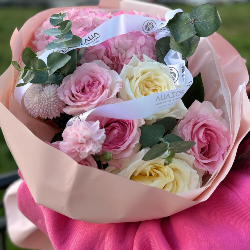 Эвкалипт - 5 дана Диантус кустовой - 3 дана Қызғылт Гортензия - 1 дана момоко - 2 дана сортовые розы - 5 дана
