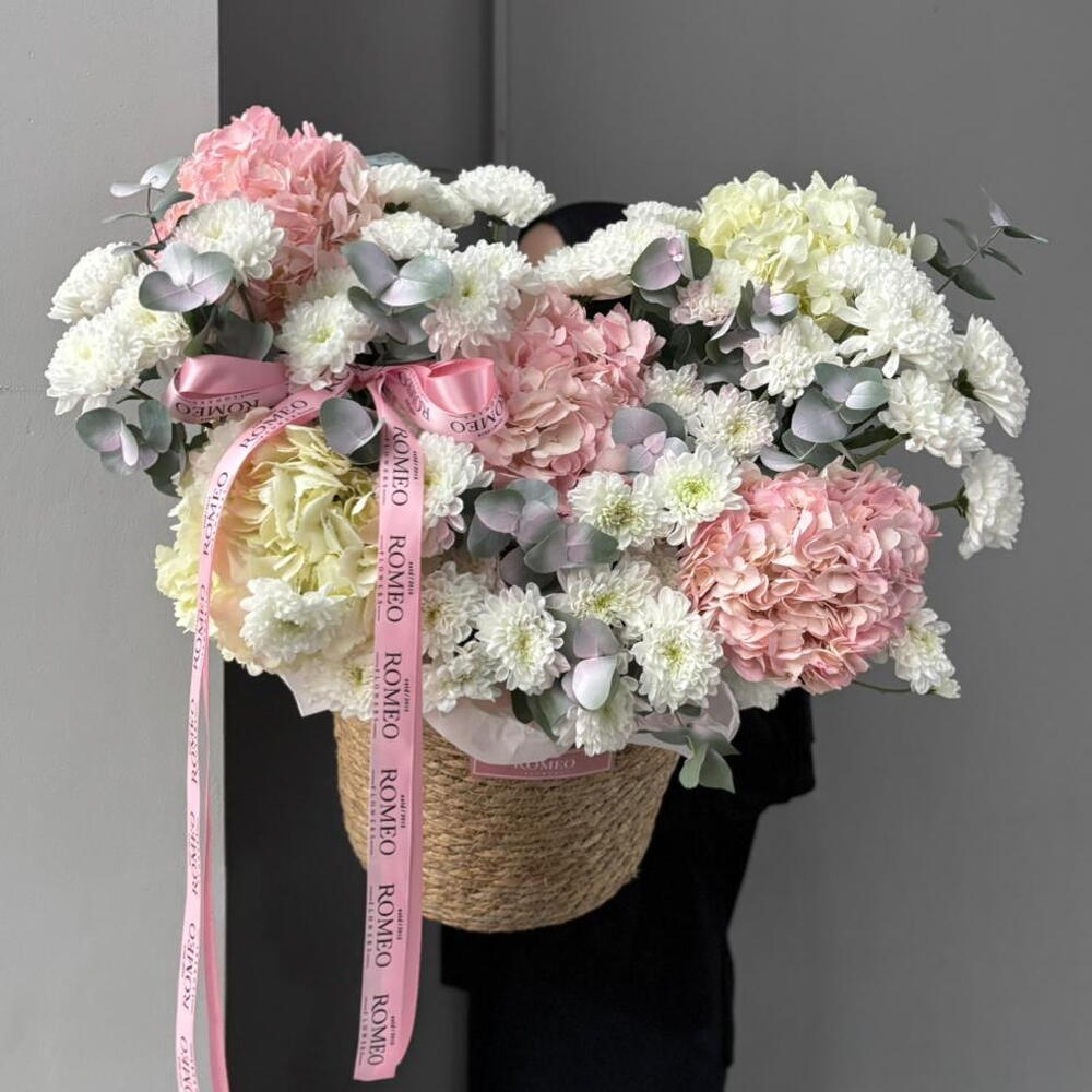 Гортензия - 5 дана Таспа - 1 дана Хризантема бұтасы - 5 дана Эвкалипт - 2 дана Кашпо - 1 дана Тыныштық - 5 дана Оазис - 3 дана