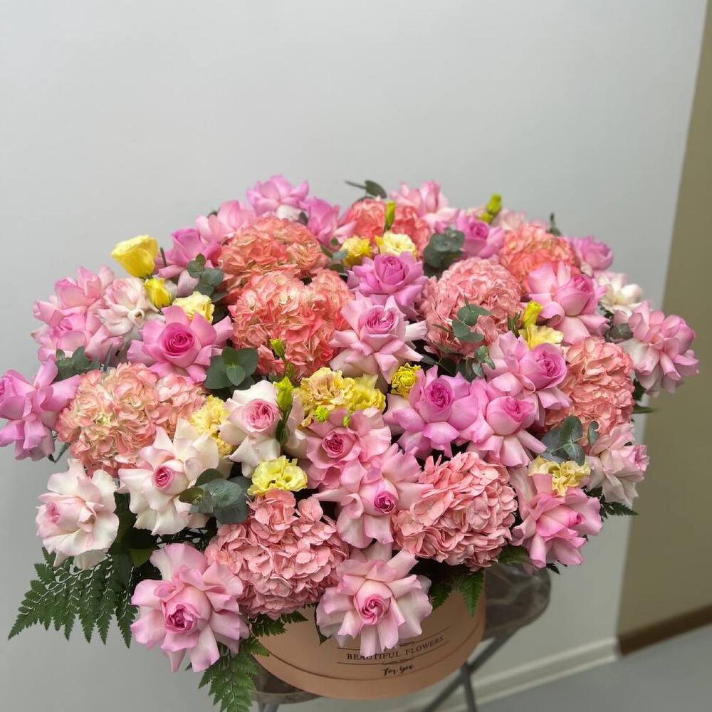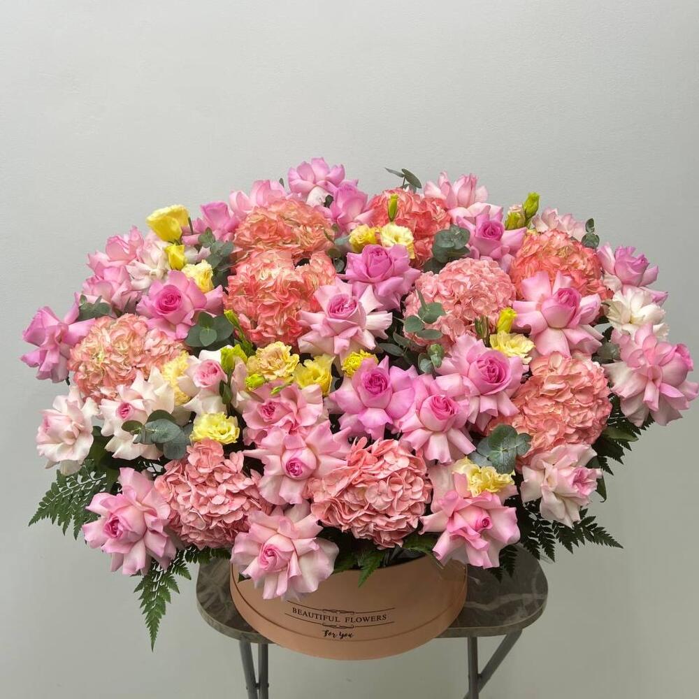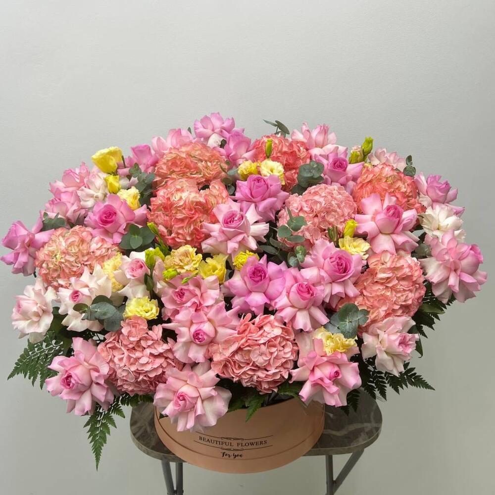 Утонченная композиция из гортензий, лизиантусов, эвкалипта и французских роз в количестве нескольких десятков штук станет настоящим произведением искусства в дизайне вашего интерьера. 9 сиреневых гортензий, 7 нежных лизиантусов, 5 веток прохладного эвкалипта и 30 роскошных французских роз – эти цветы рождают гармонию цвета и аромата. Композиция помещена в стильную коробку, что добавляет изысканности. Обладая неповторимым стилем и элегантностью, эта композиция станет идеальным подарком или дополнением к декору.