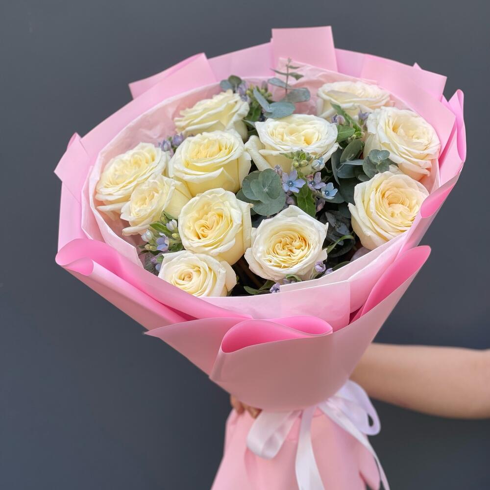 Эвкалипт - 5 дана розы эквадор - 11 дана твидия голубая - 6 дана
