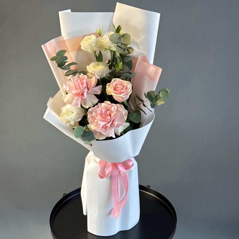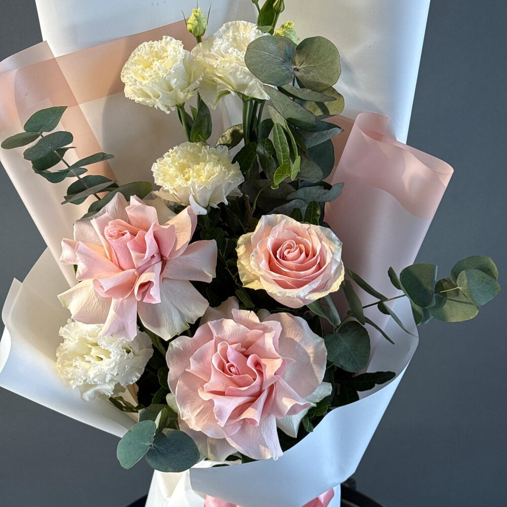 Изысканный выстроенный букет, в котором классическая красота роз гармонично сочетается с утончённой грацией эустом. Плавные линии композиции подчеркивают благородство каждого цветка: роскошные бутоны роз задают структуру, а нежные полураскрытые «чашечки» эустом добавляют воздушности и лёгкости. Мягкое переплетение оттенков и текстур создаёт ощущение утончённой элегантности и свежести. Идеальный выбор для торжественного момента, говорящий о безупречном вкусе. Наша оперативная доставка бережно доставит букет прямо в руки получателю.