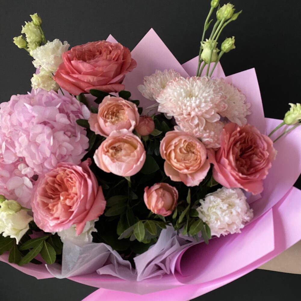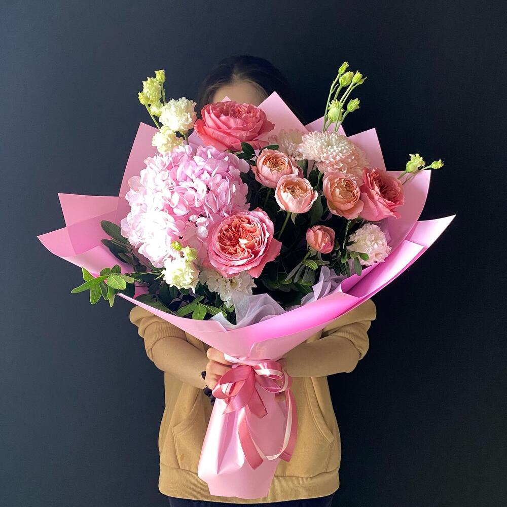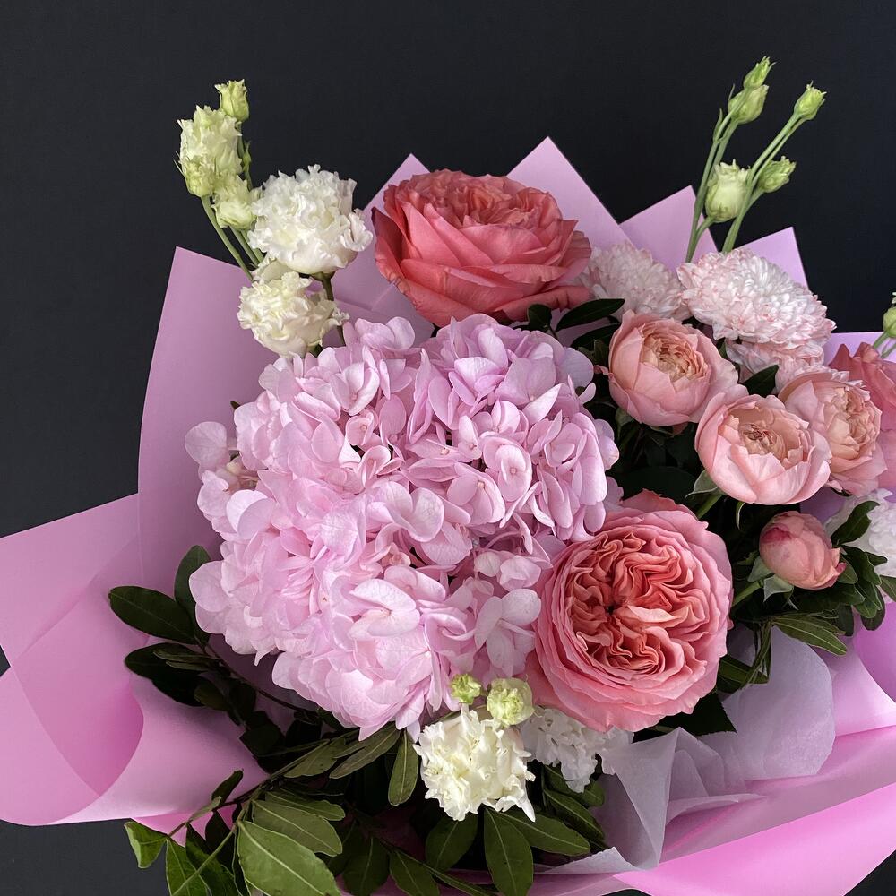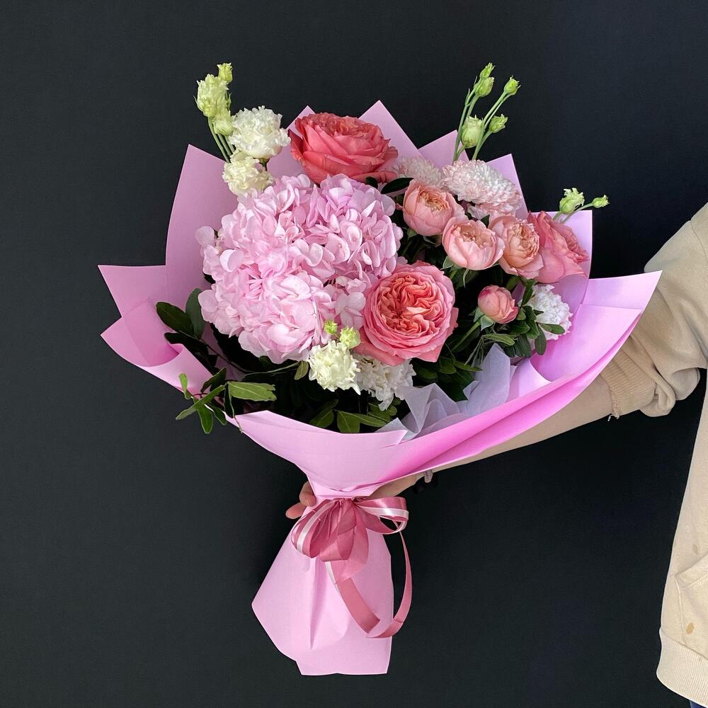 Гортензия - 1 дана Лизиантус - 2 дана Хризантема бұтасы - 1 дана Фисташка - 1 дана Роза пионовидная - 3 дана Бұта пионының раушаны - 1 дана Сіздің тілектеріңіз жазылған ашықхат - 1 дана Дизайн күңгірт пленка - 1 дана