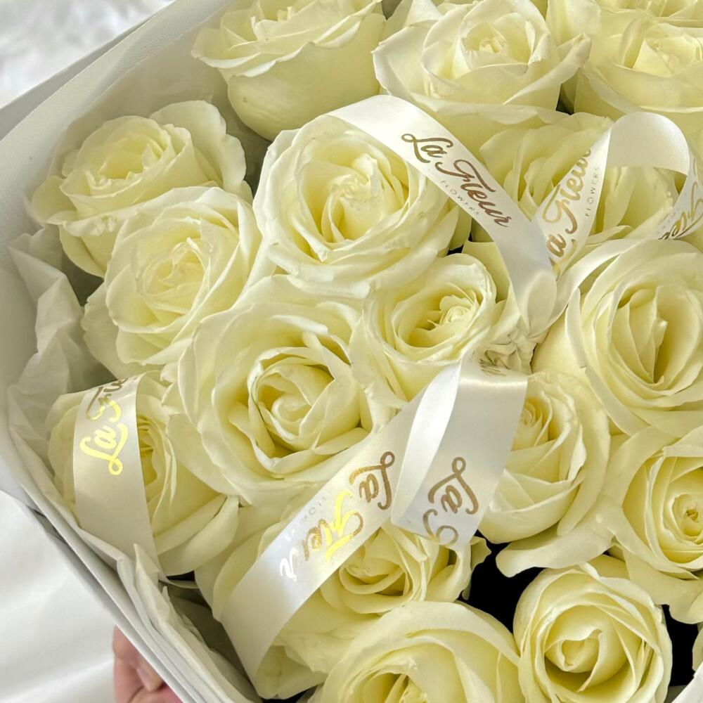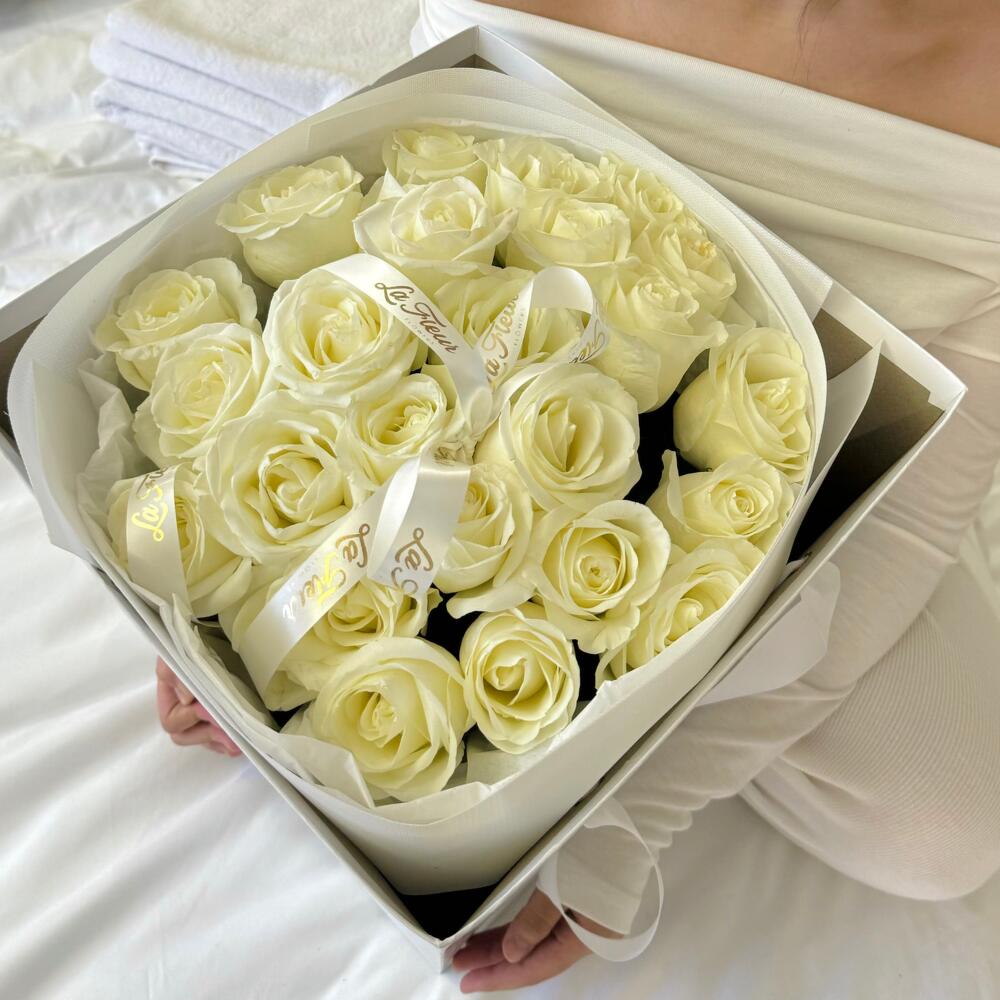 Букет из 25 кремовых роз в стильной коробке-переноске — идеальный подарок для любимой, мамы или коллеги. Нежность в каждом лепестке. Цветы премиум качества, свежесть гарантирована!