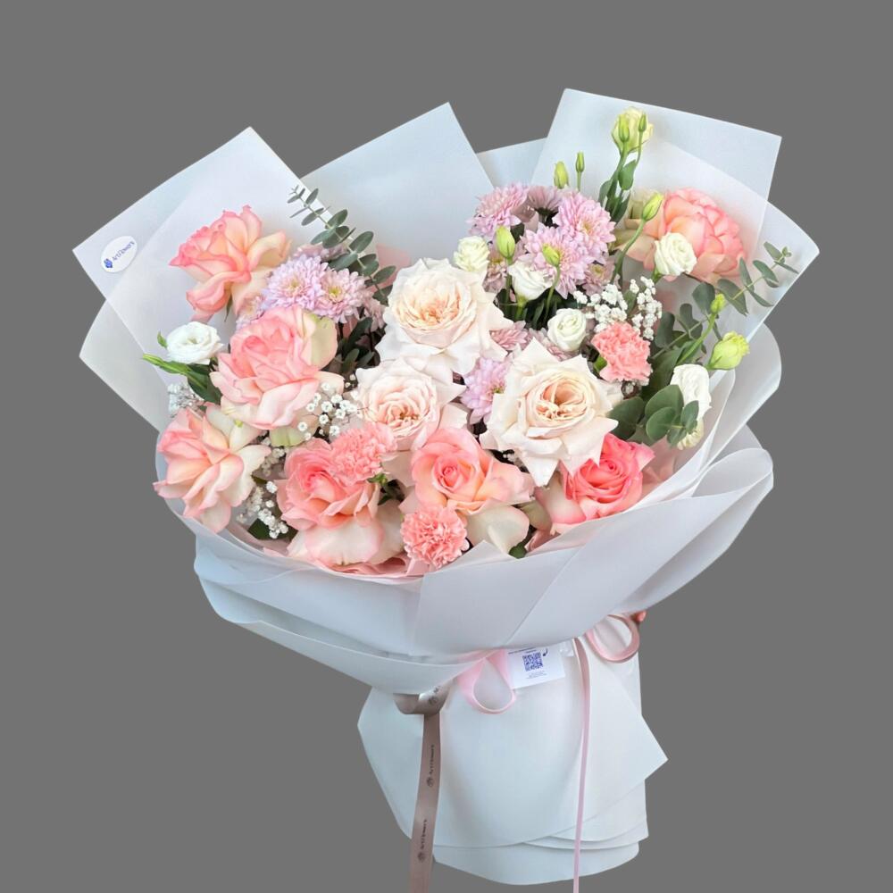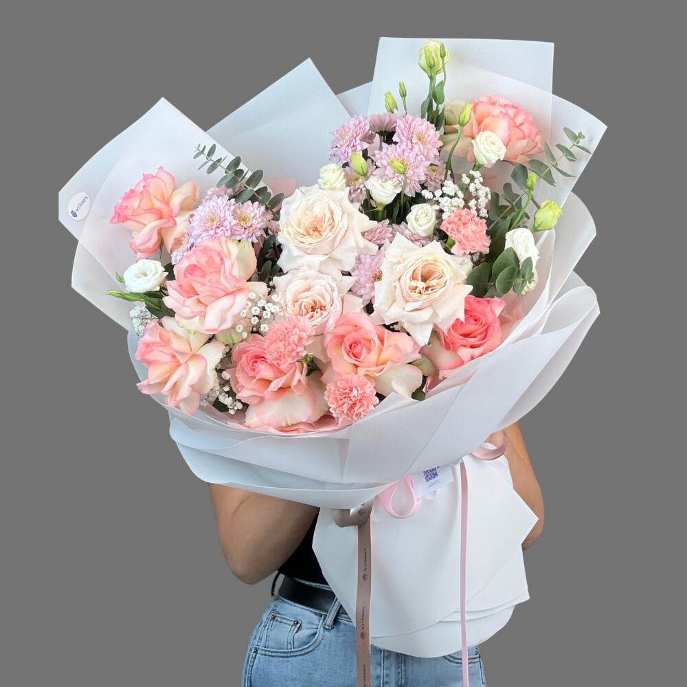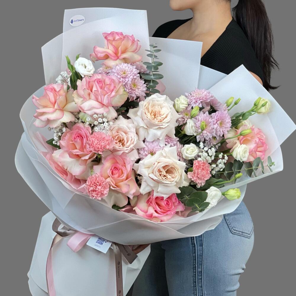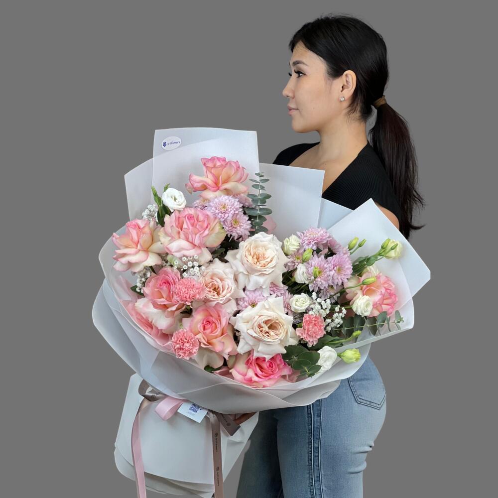 Гипсофила - 3 дана Лизиантус - 7 дана Эвкалипт - 2 дана Гвоздика - 3 дана хризантемы - 3 дана раушан - 7 дана пионовидные розы джульетта - 3 дана аква бумага - 1 дана