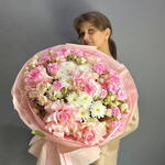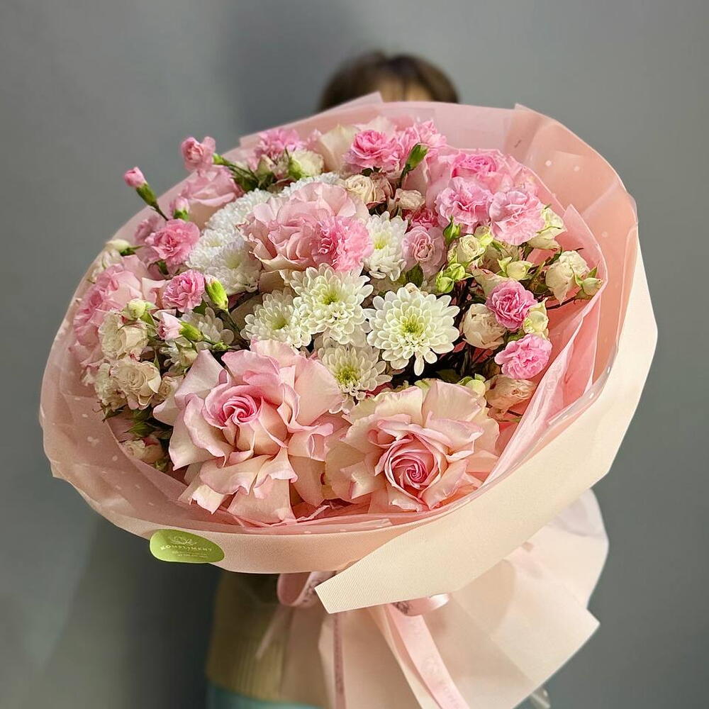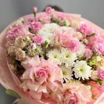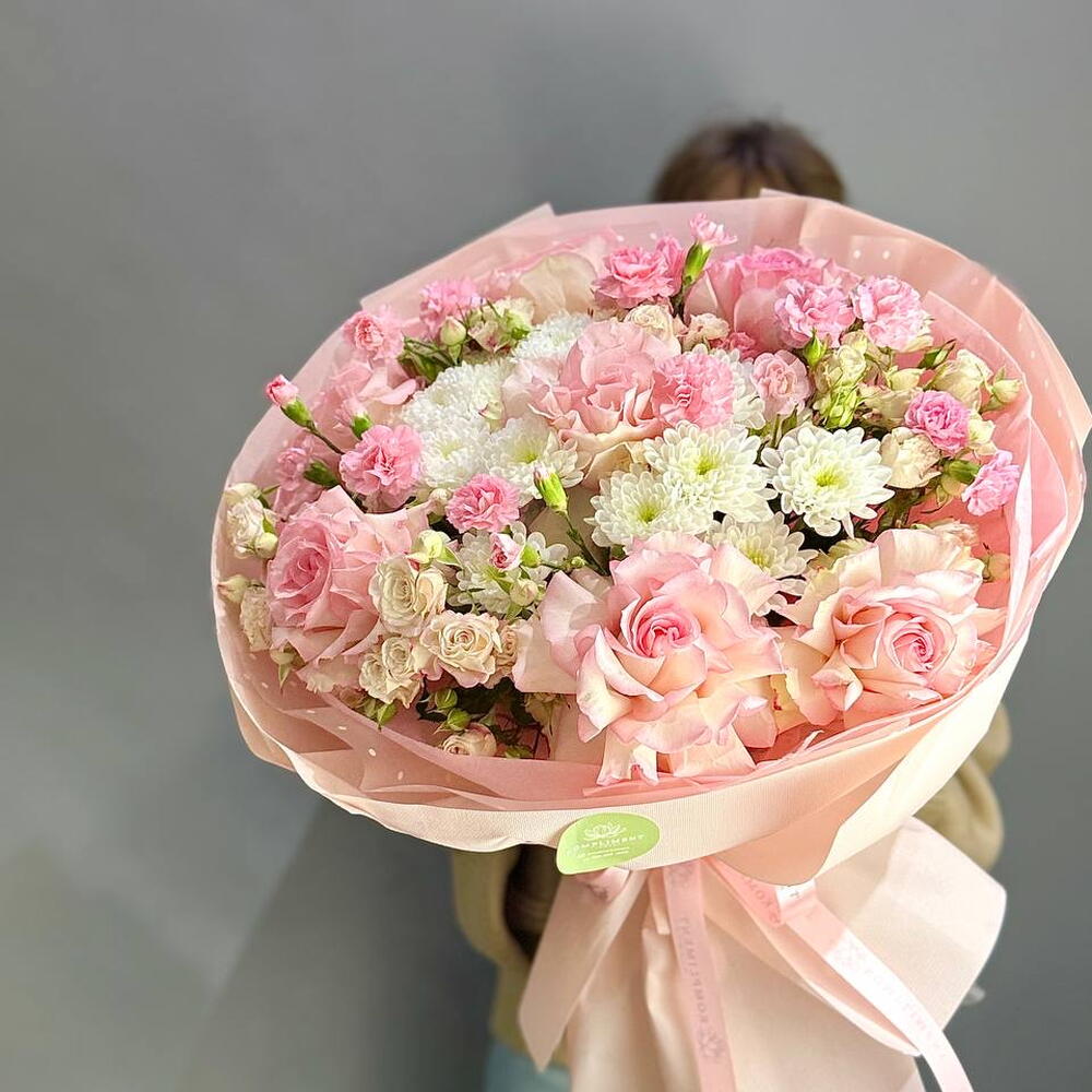 Француз қызғылт раушаны - 7 дана Ақ бұтақты диантус - 9 дана Фоамиран (қаптама) - 5 дана бұтақты қызғылт диантус - 11 дана Бұтасты хризантема Алтай - 5 дана