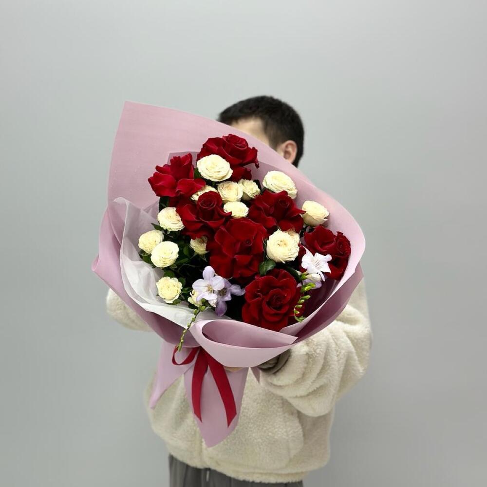Фрезия - 2 дана раушан - 7 дана кустовые пионовидные розы - 3 дана