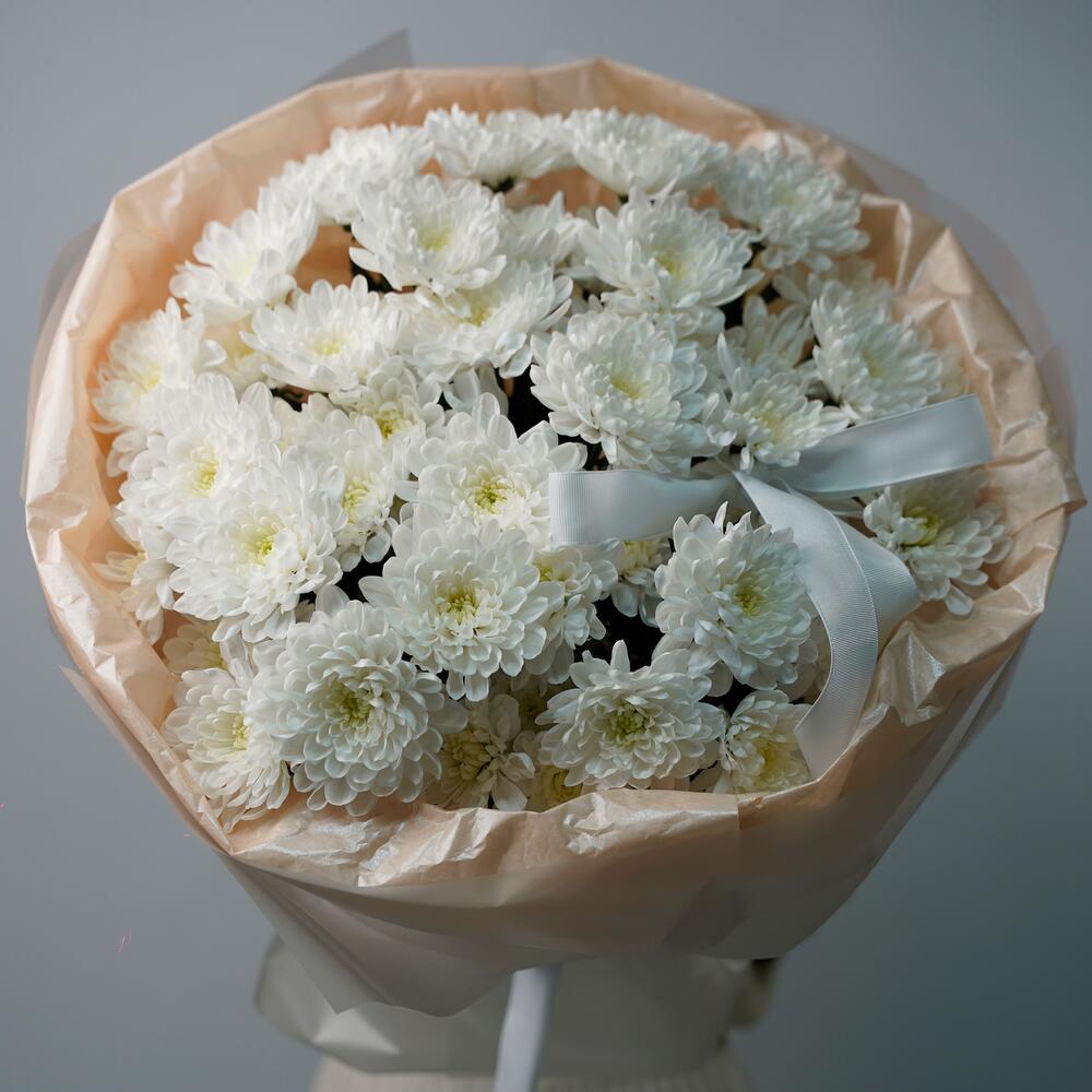 Воздушный и изысканный букет из белоснежных хризантем, напоминающий мягкое облако на ясном небе. Он символизирует чистоту, спокойствие и искренность чувств. Такой букет станет идеальным выбором, чтобы выразить благодарность, уважение или теплую заботу. Легкий шелест лепестков создает атмосферу гармонии и радости.