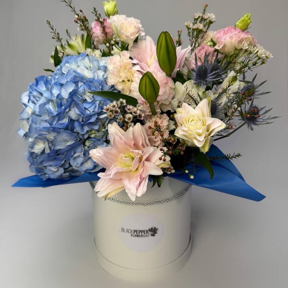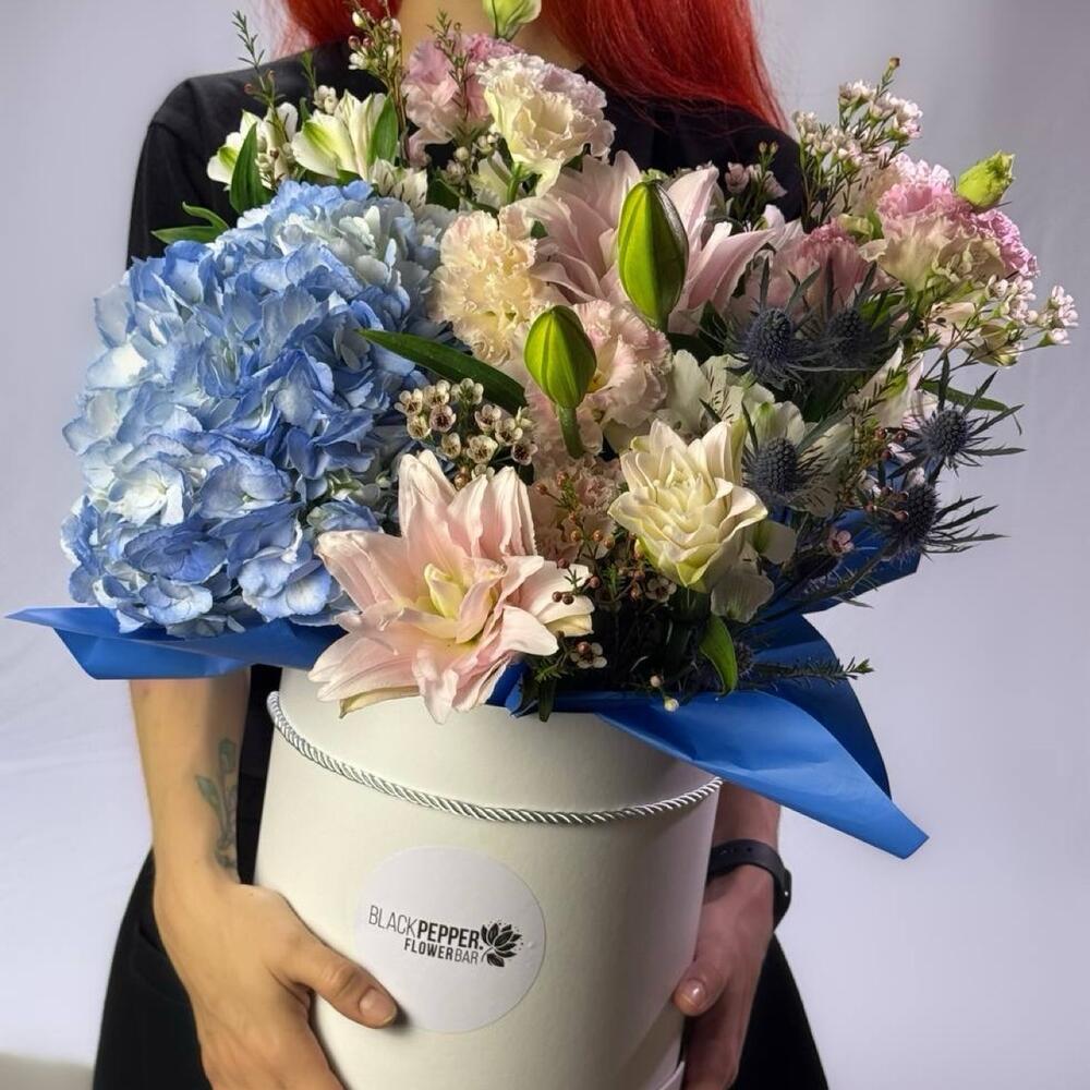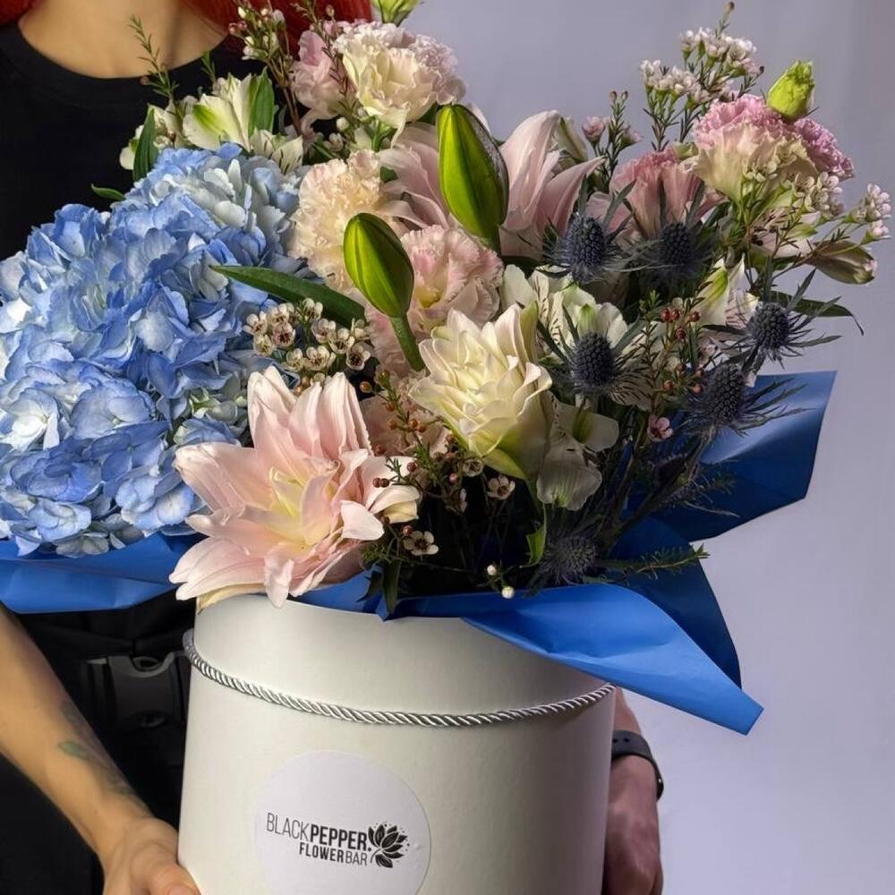 Этот любовно собранный комплект цветов в коробке объединяет в себе гармонию и утонченность. Шесть изысканных альстромерий дополняются равным количеством ваксфлауэров, вместе они создают уникальное цветовое сочетание. В центре коробки торжественно царит одна гортензия, будто королева цветов. Подчёркивает и дополняет этот цветочный ансамбль одинокая лилия, а рядом с ней с сочной зеленью эрингиум. Завершают этот волшебный букет две эустомы, добавляя в него нотки утонченной изысканности. Эта коробка - идеальный подарок для любимого человека или для выражения искренних чувств и намерений.