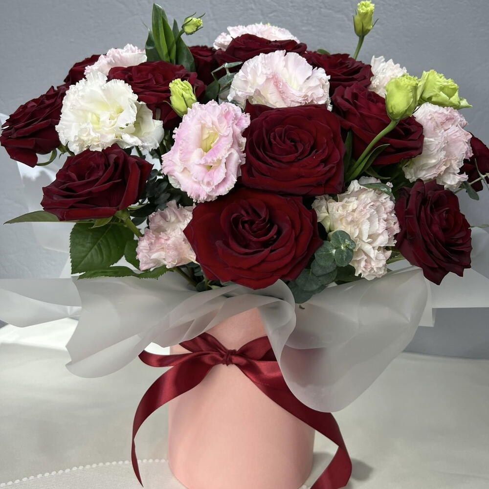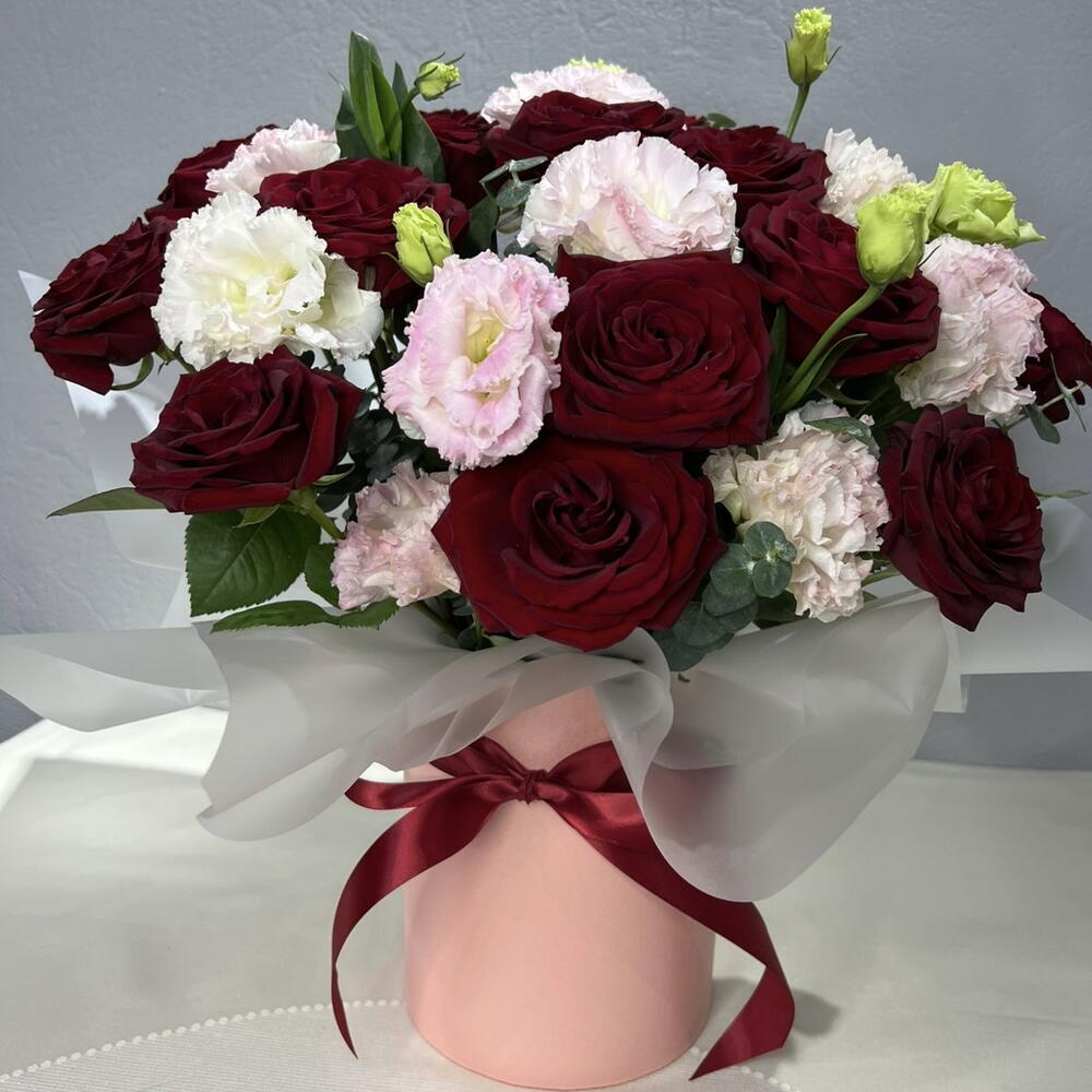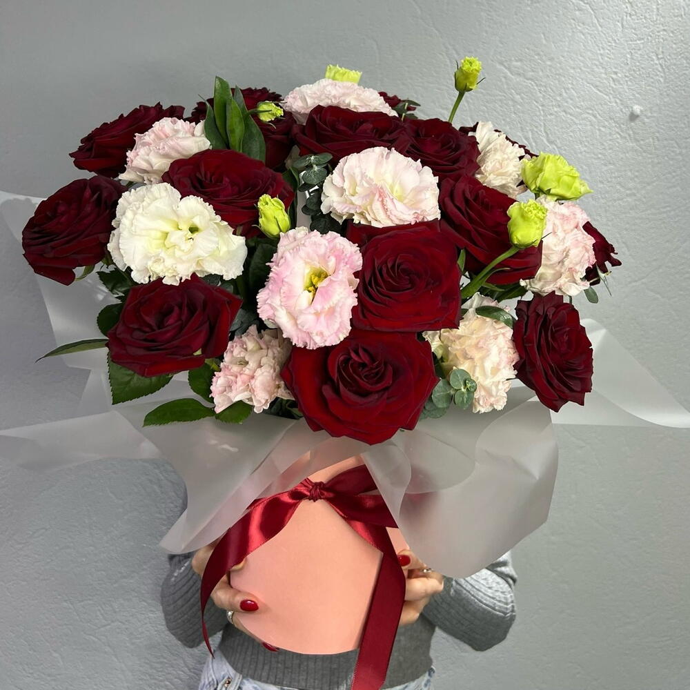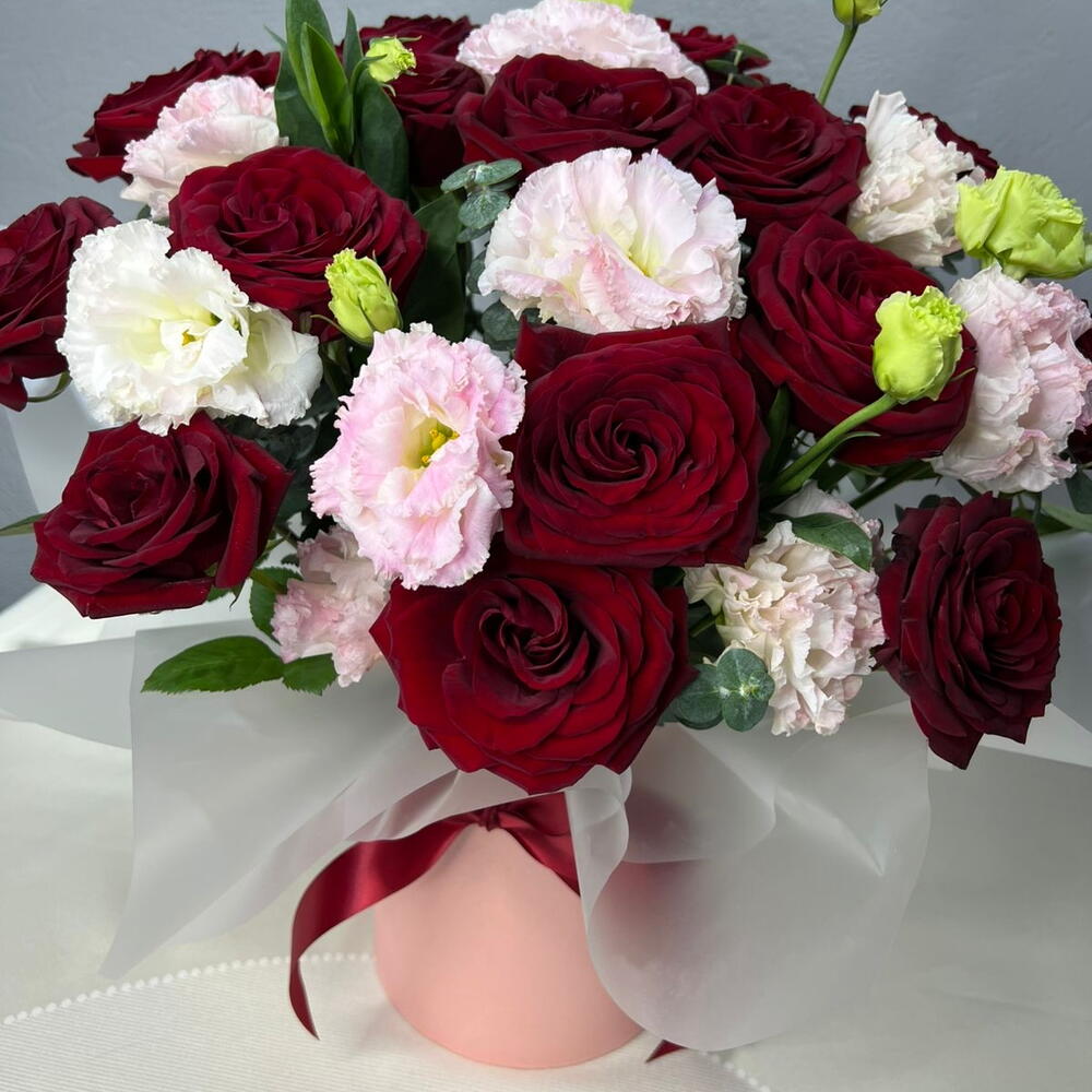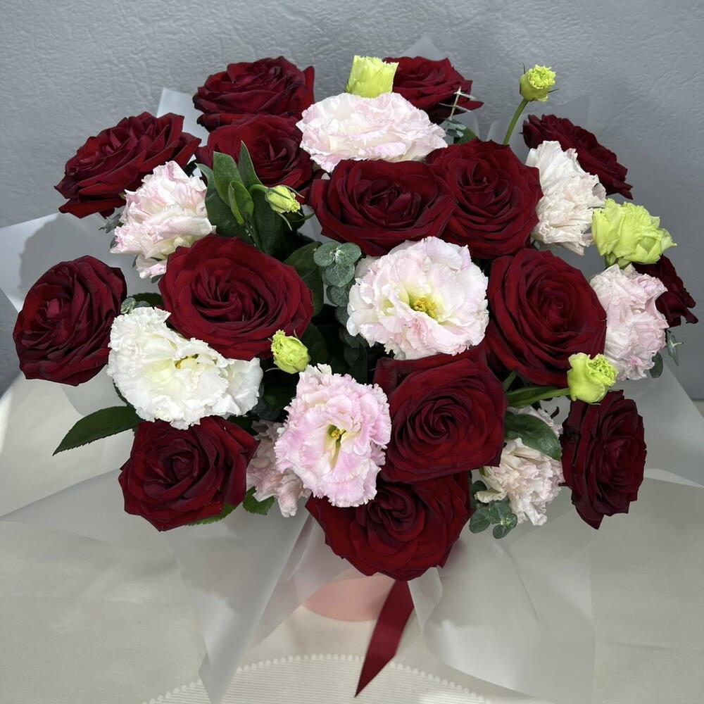 Красные розы - эмоции, желания льются через край, розовые цветы лизиантуса - название означает прекрасные уста, сдобренные разумностью и нейтрализующим все «вредности» дыханием эвкалипта - все это в идеально удобной форме - коробке с флористической губкой, ловко задекорированной аква бумагой, полупрозрачной и холодной, дабы чуть погасить накал красного перед важным разговором. Композиция очень уместна как презент перед встречей, или как декор в помещении, где надо поговорить, что-то выяснить, найти общий язык или заключить важный договор, соглашение. Эта композиция уместна там , где речь станет убедительной, а разговор результативным! Наслаждайтесь!