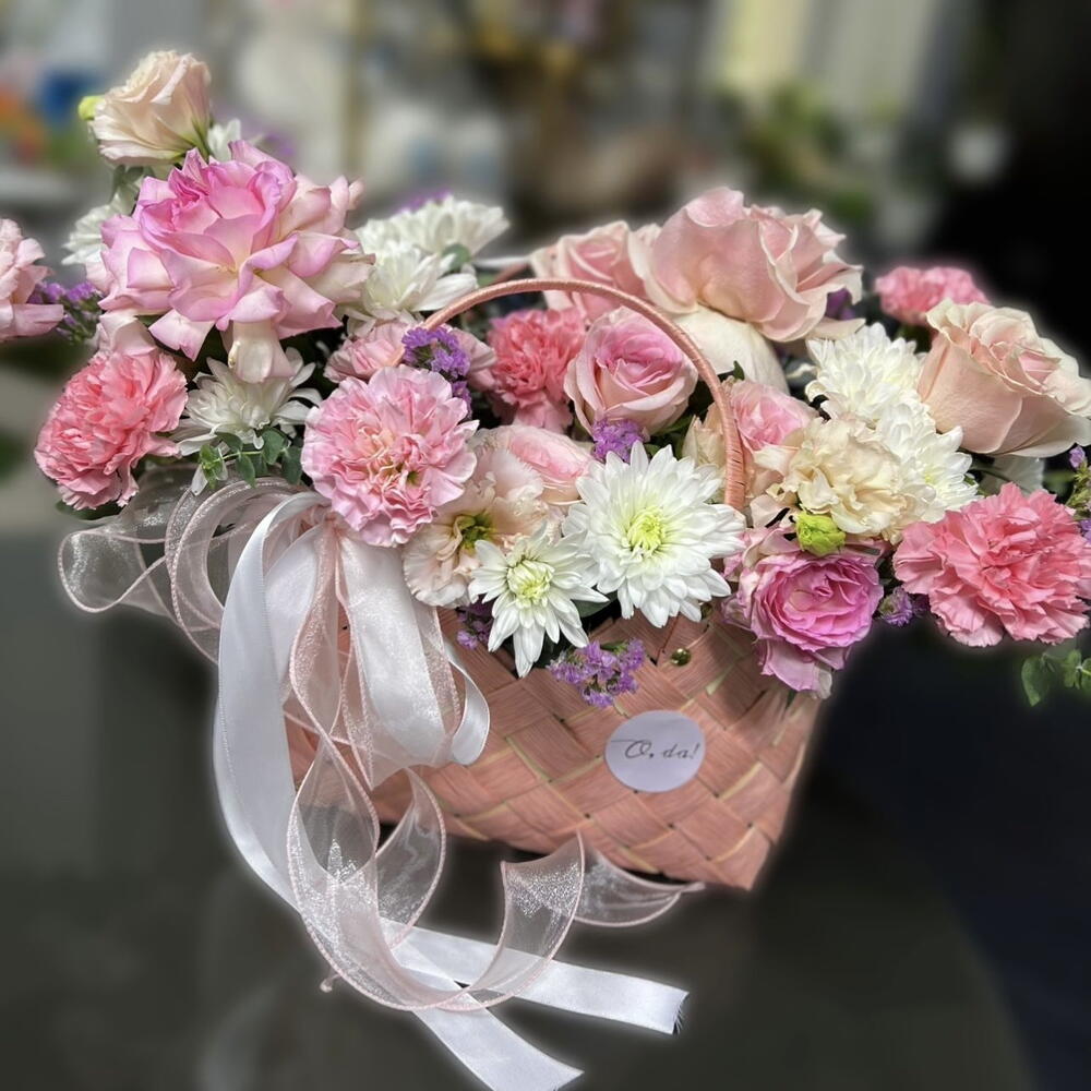 Вся цветочная полянка в этой плетеной сумочке- корзинке! Цветы подобраны по милому сочетанию форм и оттенков, запаху и текстуре, находятся в декорированной аква бумагой флористической губке. Корзинка украшена лентой, удобна для вручения элегантной даме, даме сердца, любимой и родной, по любому поводу, вообще без повода! Наслаждайтесь!
