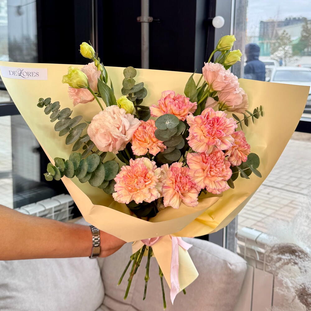 Обворожительный авторский букет, в котором гармонично сочетаются 4 яркие эустомы и 7 нежных диантусов. Букет способен перенести вашу заботу и внимание к получателю, оставляя незабываемые впечатления.