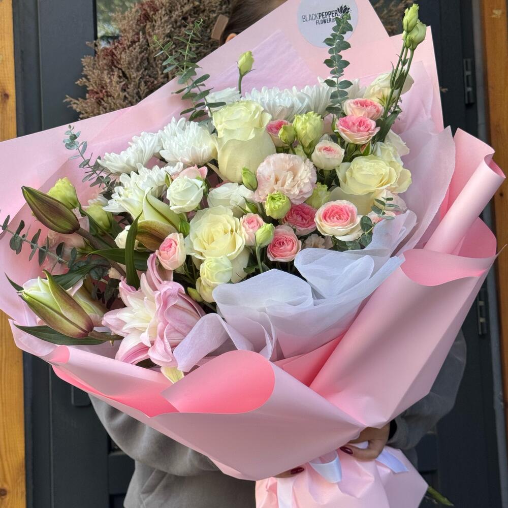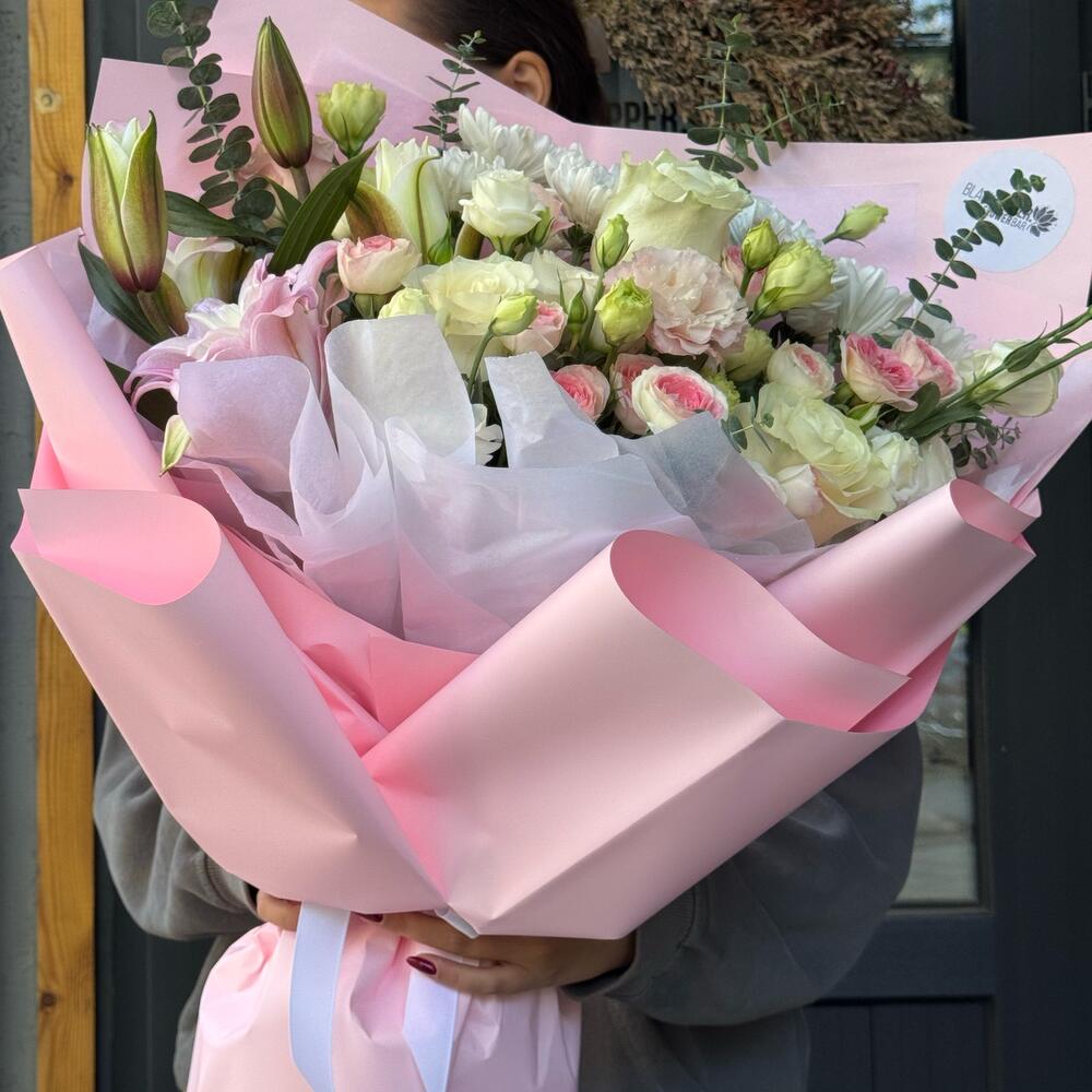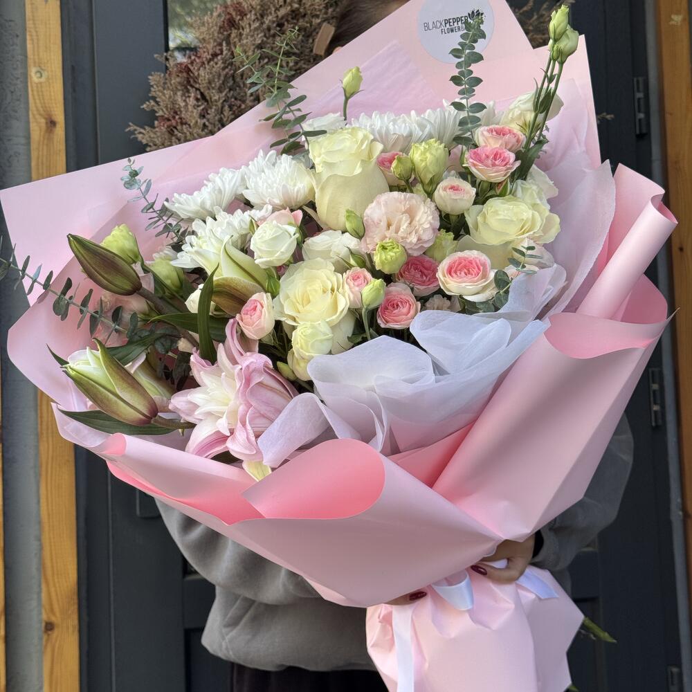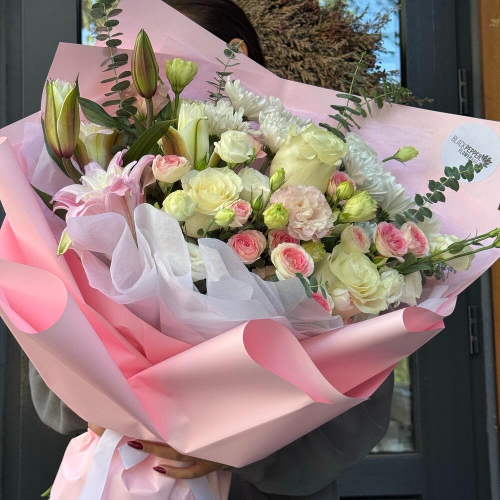 Лилия - 1 дана Хризантема бұтасы - 2 дана Эвкалипт - 5 дана Раушан - 3 дана Бұта раушаны - 3 дана Эустома - 3 дана