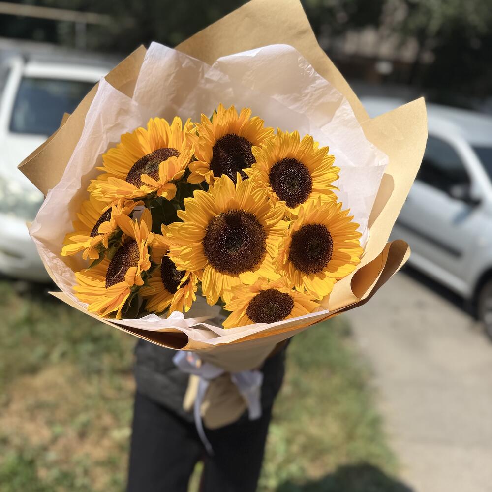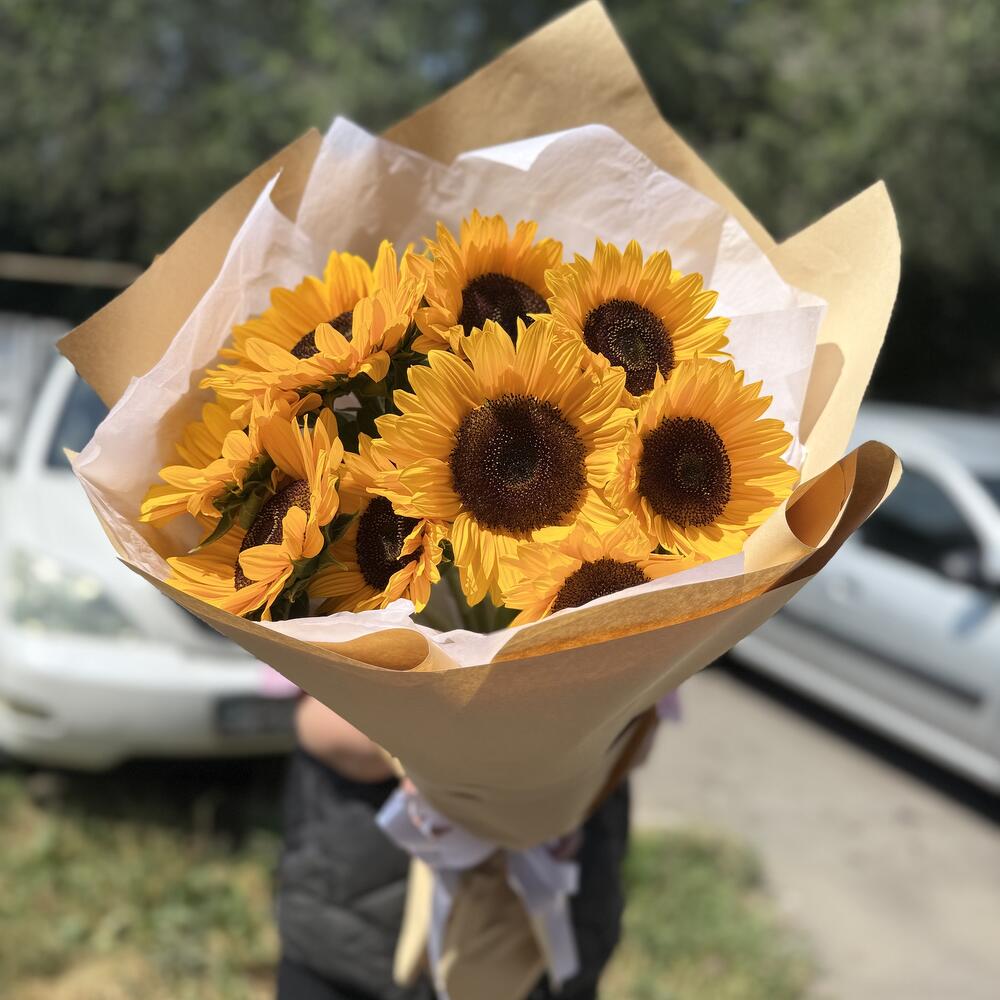 Букет из подсолнухов — это солнечное настроение в каждой детали. Яркие, золотистые цветы излучают тепло и радость, словно хранят в себе лучи лета. Он простой, но эффектный — будто улыбка, подаренная от души.