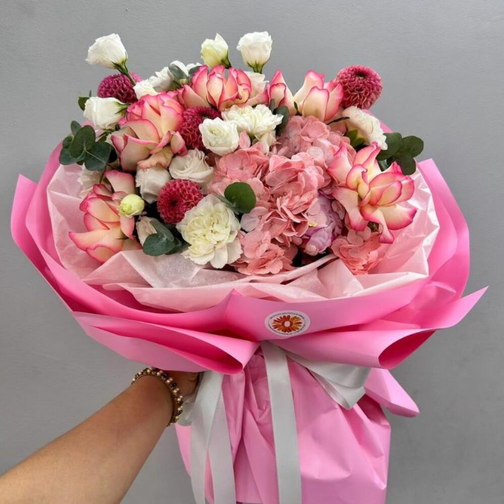 Прекрасный евро букет цветов в Алматы с доставкой по всему городу Ищете идеальный букет для особого случая? Прекрасный евро букет цветов в Алматы от Оранж Алматы — это элегантный и утончённый подарок, который обязательно произведет впечатление. Состав букета: Розы: 5 шт. Лизиантусы: 3 шт. Гортензия: 1 шт. Гвоздики: 5 шт. Зелень пионов: 1 шт. Георгины: 4 шт. Эвкалипт: 1 шт.